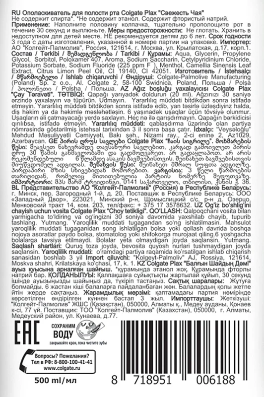 Использование ополаскивателя обеспечивает 12-часовую защиту от распространения вредных бактерий и помогает предотвратить кариес. Нежный вкус чая приятно освежает полость рта и дарит свежесть надолго. Colgate Plax Свежесть чая не вызывает неприятного ощущения жжения в полости рта и дарит ощущение свежести в 10 раз дольше, чем после обычной чистки зубов.
