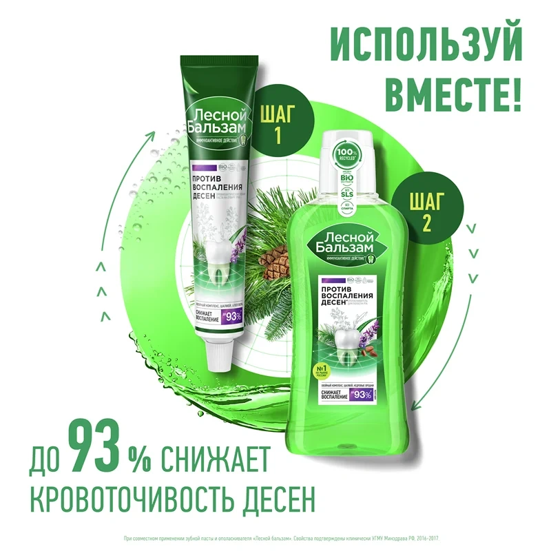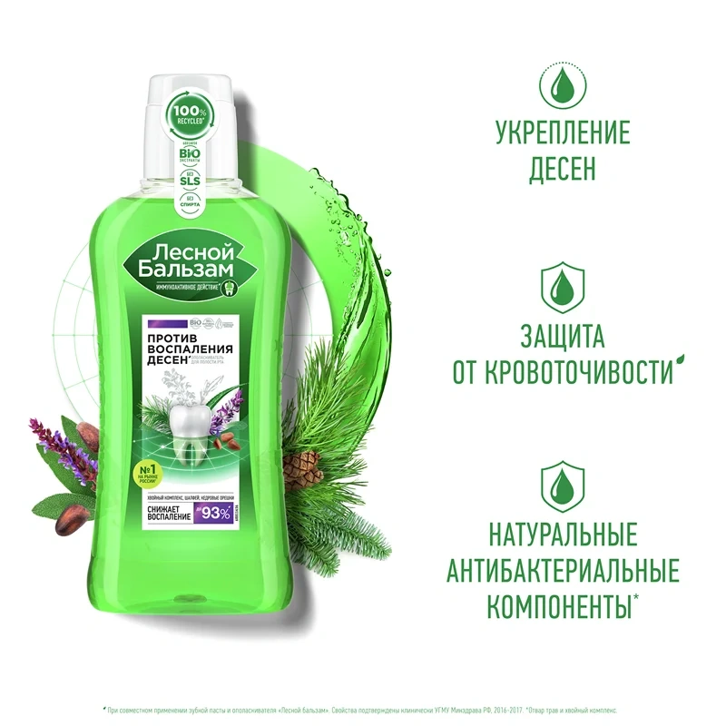 Профилактический ополаскиватель Лесной бальзам на отваре трав с шалфеем - эффективное средство для полоскания десен с выраженным противовоспалительным эффектом.