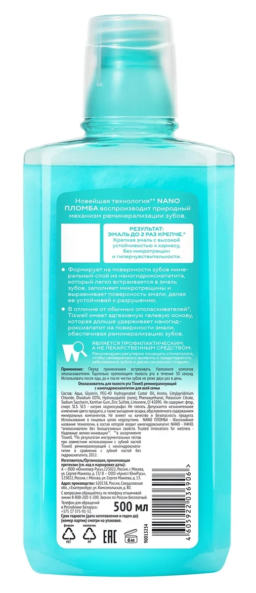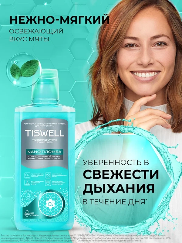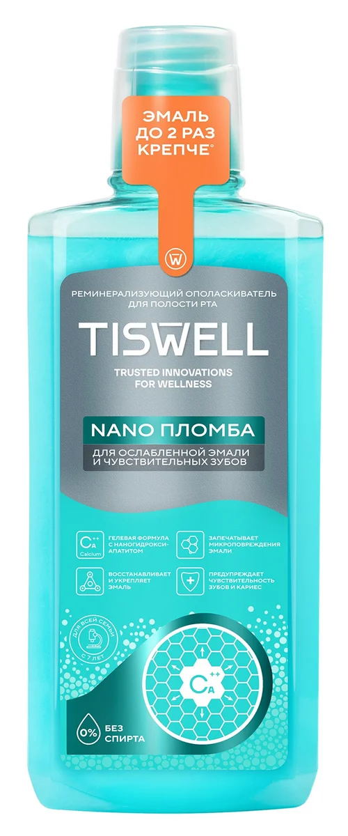 Ополаскиватель полости рта Tiswell за счет технологии Nano пломба воспроизводит природный механизм реминерализации зубов. Ополаскиватель для зубов с кальцием запечатывает микроповреждения эмали, восстанавливает и укрепляет ее. В отличие от обычных средств, ополаскиватель рта Tiswell имеет адгезивную гелевую основу, которая дольше удерживает наногидроксиапатит на поверхности эмали, обеспечивая реминерализацию зубов. Средство не имеет в составе фтора и спирта. Ополаскиватель рта подходит для всей семьи, включая детей с 7 лет. Nano пломба - Фантазийное название технологии, в состав которой входит наногидроксиапатит.