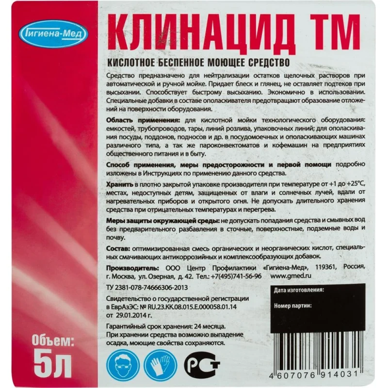 Профессиональное средство для мойки пищевого оборудования Клинацид ТМ 5 л Назначение: Средство предназначено для нейтрализации остатков щелочных растворов при автоматической и ручной мойке. Придает блеск и глянец посуде и не оставляет подтеков при высыхании. Способствует быстрому высыханию. Экономично в использовании. Специальные компоненты в составе ополаскивателя предотвращают образование отложений на поверхности оборудования. Область применения: для кислотной мойки технологического оборудования: емкостей, трубопроводов, тары, линий розлива, упаковочных линий; для ополаскивания посуды, поддонов, подносов и др. в посудомоечных и ополаскивающих машинах различного типа, кофе-машин на предприятиях общественного питания и в быту. Способ применения: Для мойки поверхностей рекомендуется использовать рабочий раствор 0,05-0,5 %-ой концентрации. Концентрация рабочего раствора зависит от характера и степени загрязненности поверхности, типа оборудования и метода применения. Температура воды, используемая для приготовления рабочего раствора от 50 С до 60 С. Меры предосторожности: Не допускать попадания средства и смывных вод без предварительного разбавления в сточные, поверхностные, подземные воды и почву. Условия хранения: Хранить в плотно закрытой упаковке производителя при температуре от 1 C до 25 C, местах, недоступных детям, защищенных от влаги и солнечных лучей, вдали от нагревательных приборов и открытого огня. Не допускать длительного хранения средства при отрицательных температурах и перегрева. Состав: оптимизированная смесь органических и неорганических кислот, специальных смачивающих антикоррозийных и комплексообразующих компонентов. Срок хранения: 24 месяца.