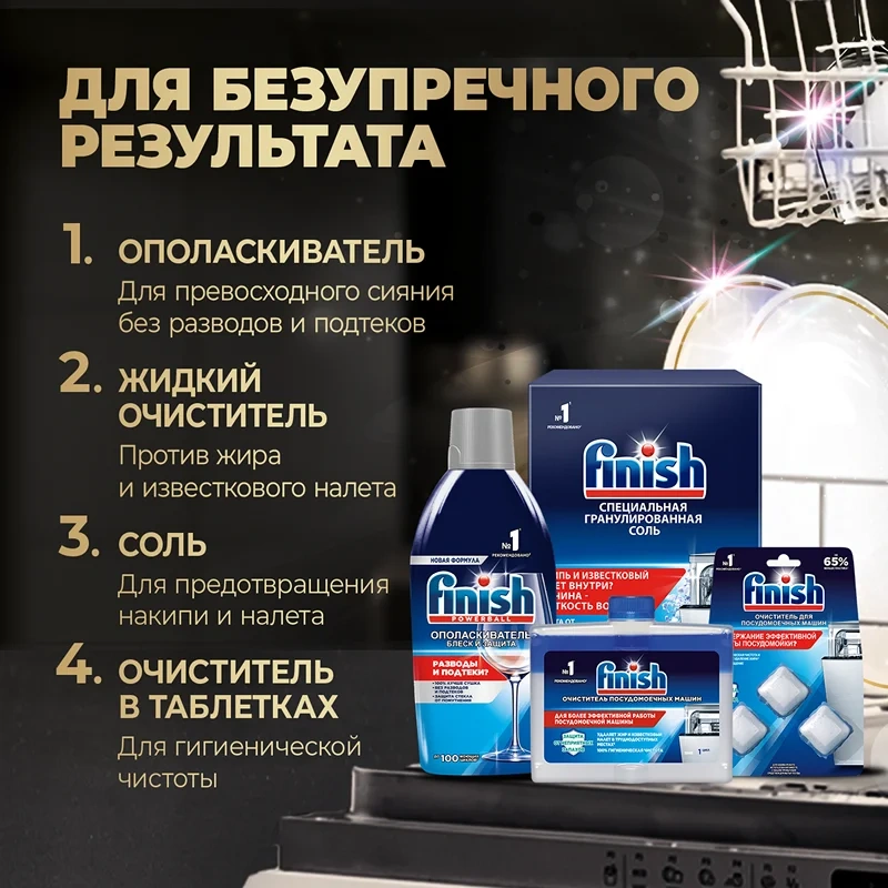 При мытье в посудомоечной машине на посуде могут остаться подтеки и следы от капель воды. Для борьбы с этой проблемой и ускорения процесса сушки рекомендуется добавлять ополаскиватель Finish. Он борется с подтеками, ускоряет процесс сушки, борется со следами от капель, придает посуде блеск. Работает на финальном этапе цикла мойки, его формула обеспечивает дополнительную защиту от помутнения (коррозии) стекла и придает ослепительное сияние вашим стаканам и бокалам. Рекомендуется, чтобы отсек с ополаскивателем всегда был заполнен. Проверяйте и добавляйте ополаскиватель один раз в месяц или при мигании соответствующего индикатора на внешней панеле посудомоечной машины, который указывает на низкий уровень средства.