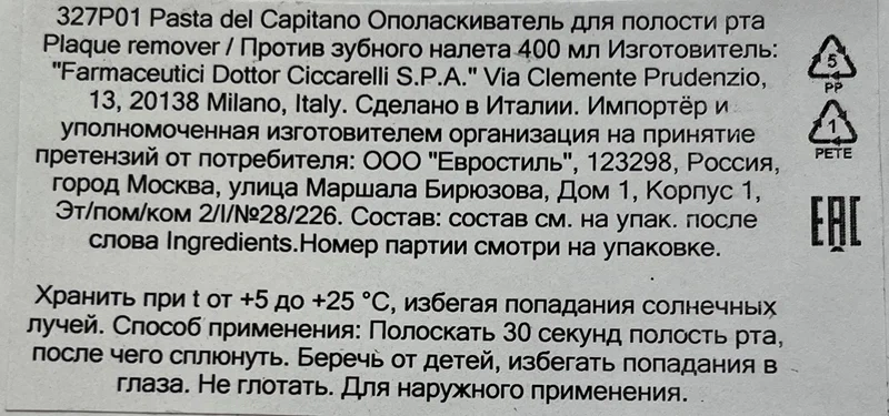 Ополаскиватель для рта Pasta del Capitano против налета, 400мл