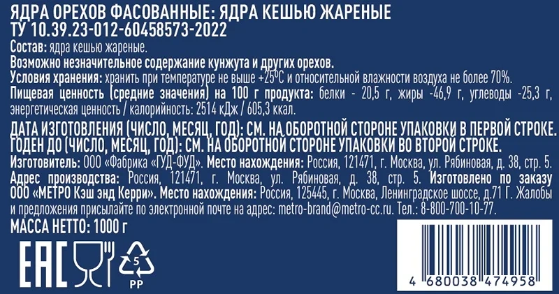 Кешью жареный, WELDAY, пакет, 1000 г, 622474