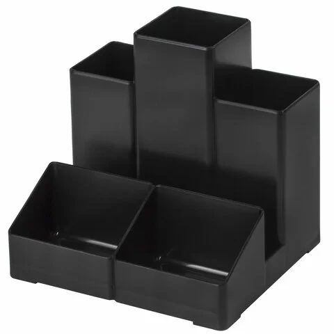 Изготовлена из высококачественного пластика. Имеет размеры 109х101,5х95 мм. Состоит из 5-ти отделений: двух - для канцелярских мелочей и трех - для пишущих принадлежностей. Между отделениями есть место под листочки для записей. Поставляется без канцелярского наполнения.
