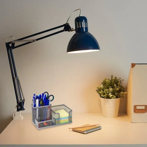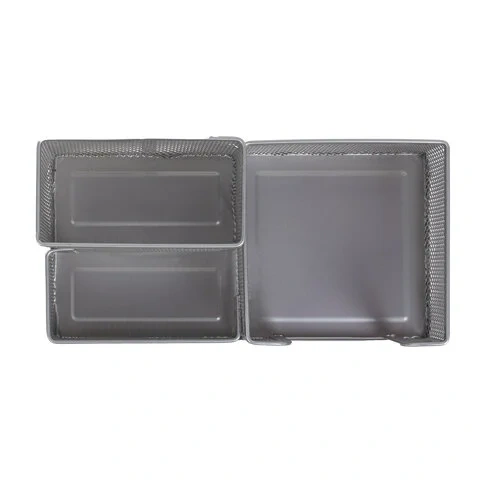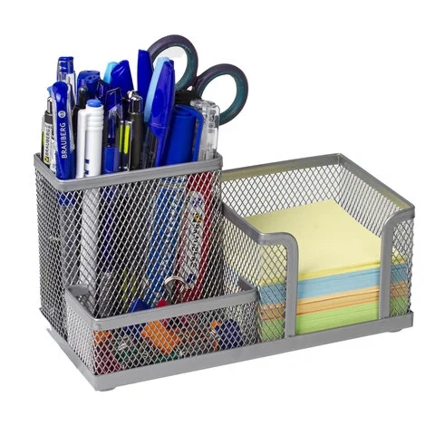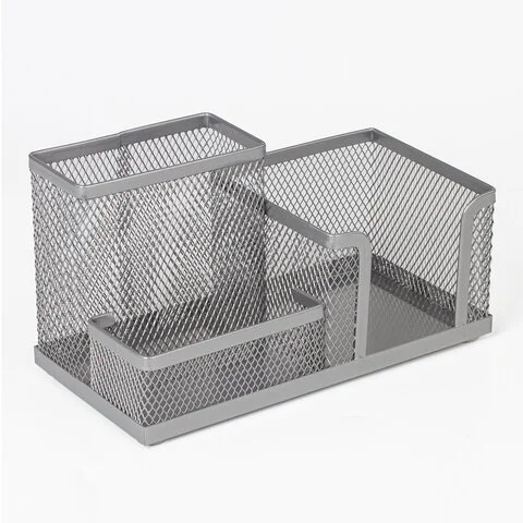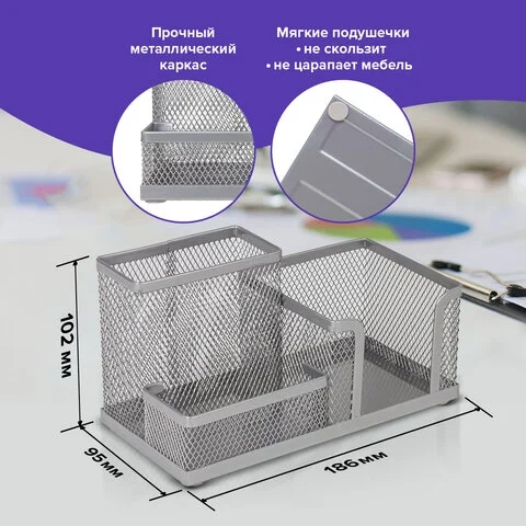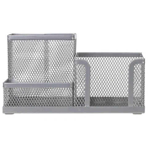 Изготовлена из металлической сетки. Имеет размеры 102х186х95 мм. Состоит из 3-х отделений: одного - для бумажного блока размером 90х90 мм и двух - для пишущих принадлежностей и канцелярских мелочей. Мягкие подушечки на дне предотвращают скольжение и порчу мебели. Поставляется без канцелярского наполнения.