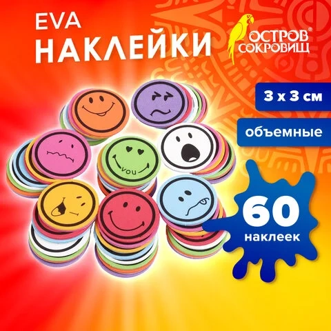 Наклейки из EVA 'Смайлики', 60 шт., ассорти, ОСТРОВ СОКРОВИЩ, 661468