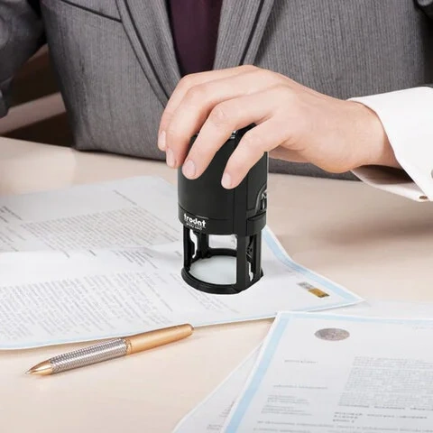 Оснастка предназначена для простановки на бумаге круглой печати. Часто используется для гербовых печатей и печатей с большим количеством информации. Сменная подушка синего цвета в комплекте.
