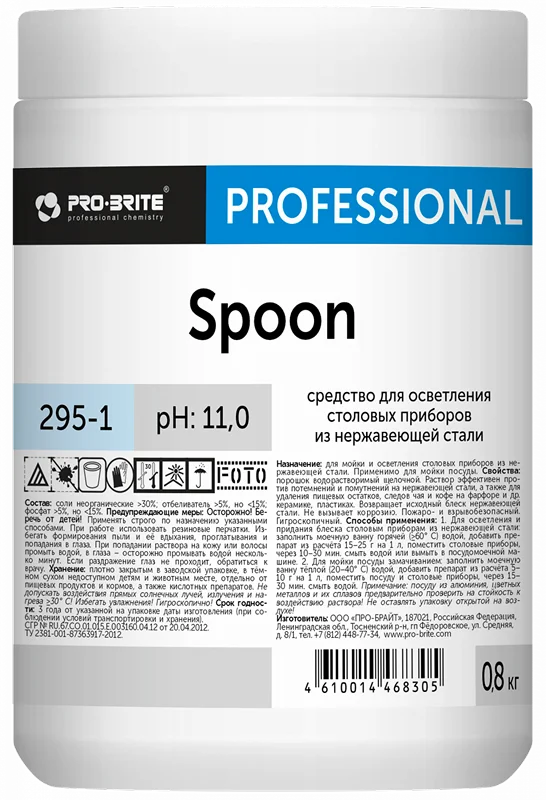 Способ применения:1. Для осветления и придания блеска столовым приборам из нержавеющей стали: заполнить моечную ванну горячей (до 60° С) водой, добавить препарат из расчёта 15–25 г на 1 л, поместить столовые приборы, через 10–30 мин. смыть водой или вымыть в посудомоечной машине.
