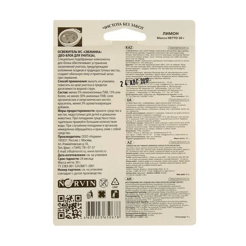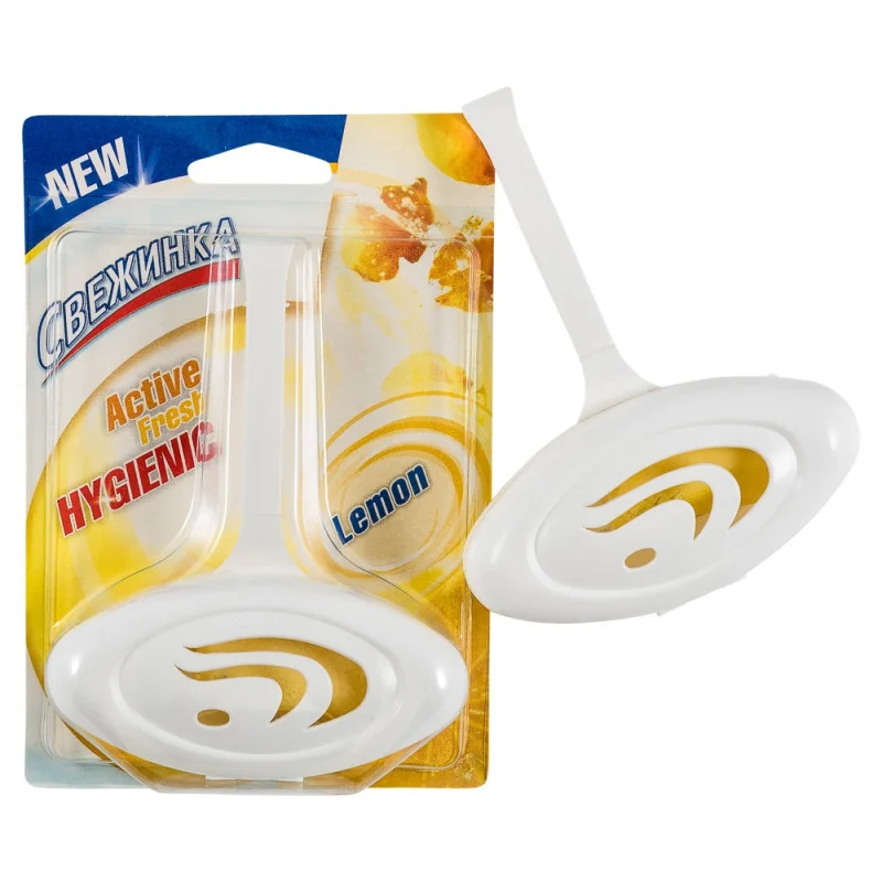 Безопасность, эталонное качество, удобство эксплуатации — главные критерии средства по уходу за туалетом. Гигиенический блок для унитаза Свежинка Лимон моющее и освежающее одновременно. Имеет длительное действие. Помогает предотвратить появление известкового налета, водного и мочевого камня.
