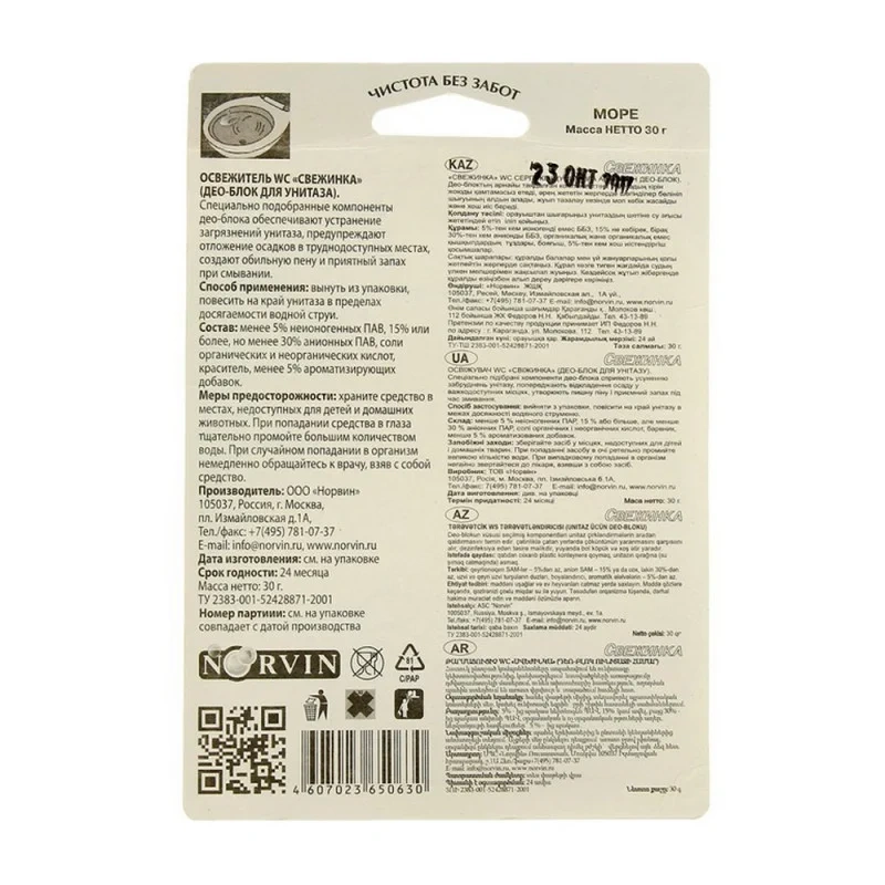 Безопасность, эталонное качество, удобство эксплуатации — главные критерии средства по уходу за туалетом. Гигиенический блок для унитаза Свежинка Океан моющее и освежающее одновременно. Имеет длительное действие. Помогает предотвратить появление известкового налета, водного и мочевого камня.
