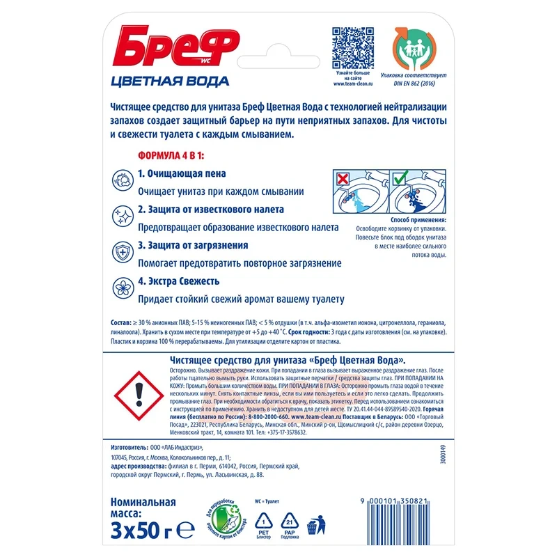 Освежитель для унитаза Bref Цветная вода цветочная свежесть, 50г х 3шт, подвесной блок