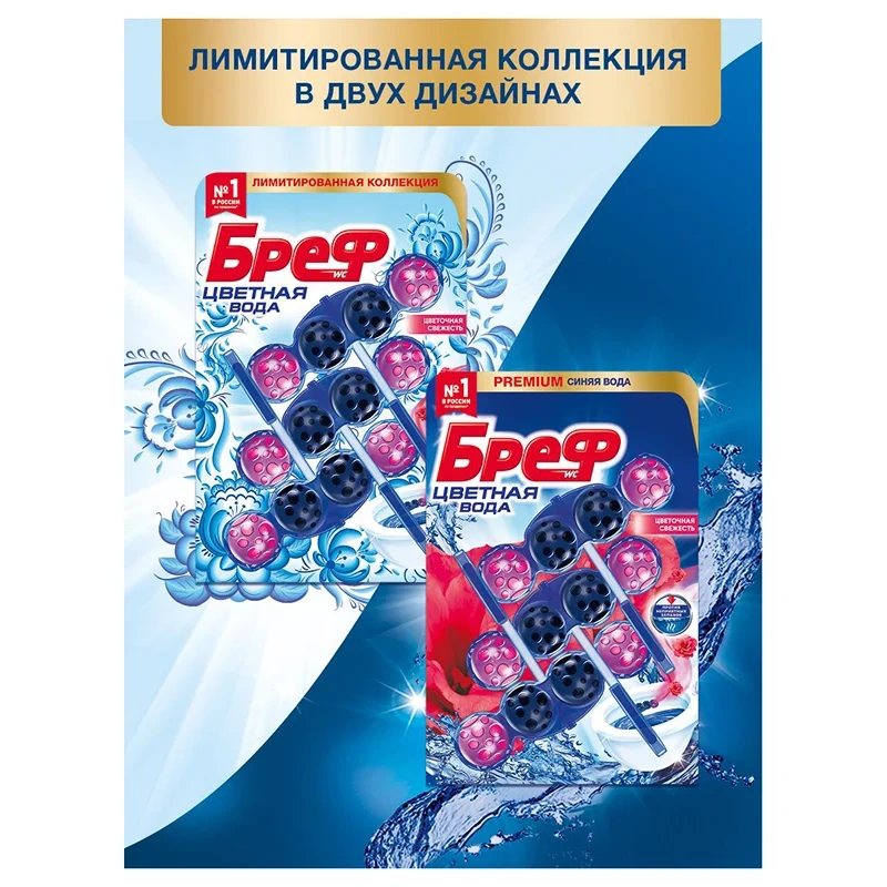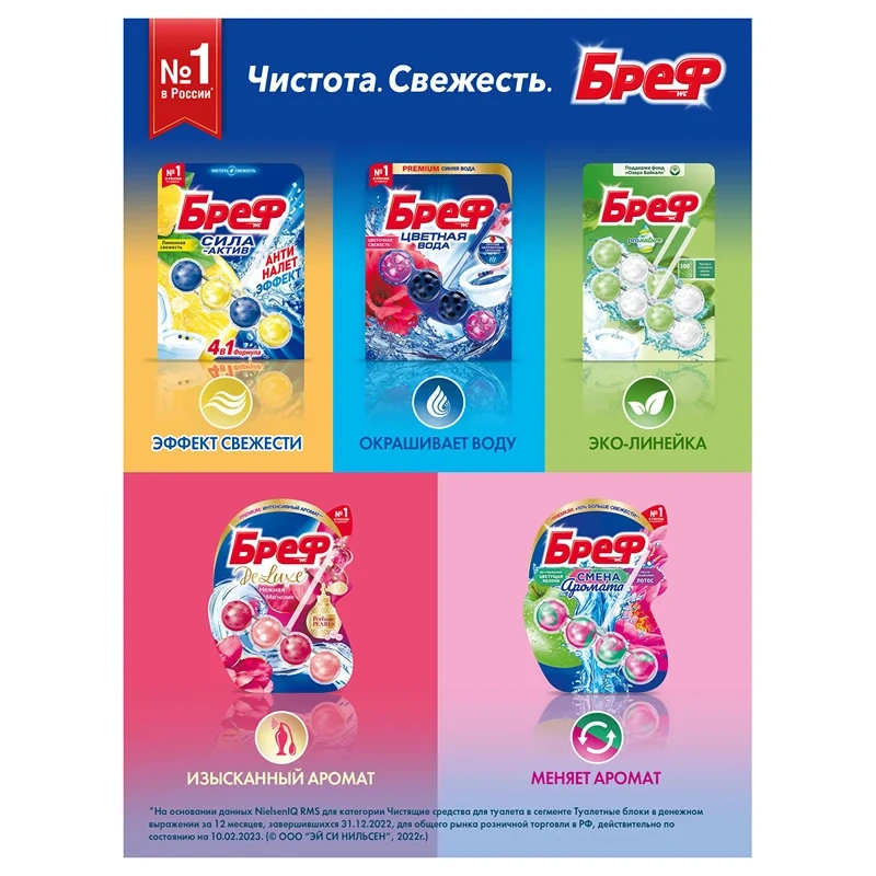 Первое средство для унитаза Bref — туалетный блок — было представлено в 1968 году, и с тех пор Bref не прекращает задавать стандарты на рынке чистящих средств для туалета. Bref — это простой способ обеспечить чистоту и свежесть туалета благодаря формуле 4в1! Средства для унитаза Bref помогут вам поддерживать чистоту и свежесть туалета между генеральными уборками до 4 недель.