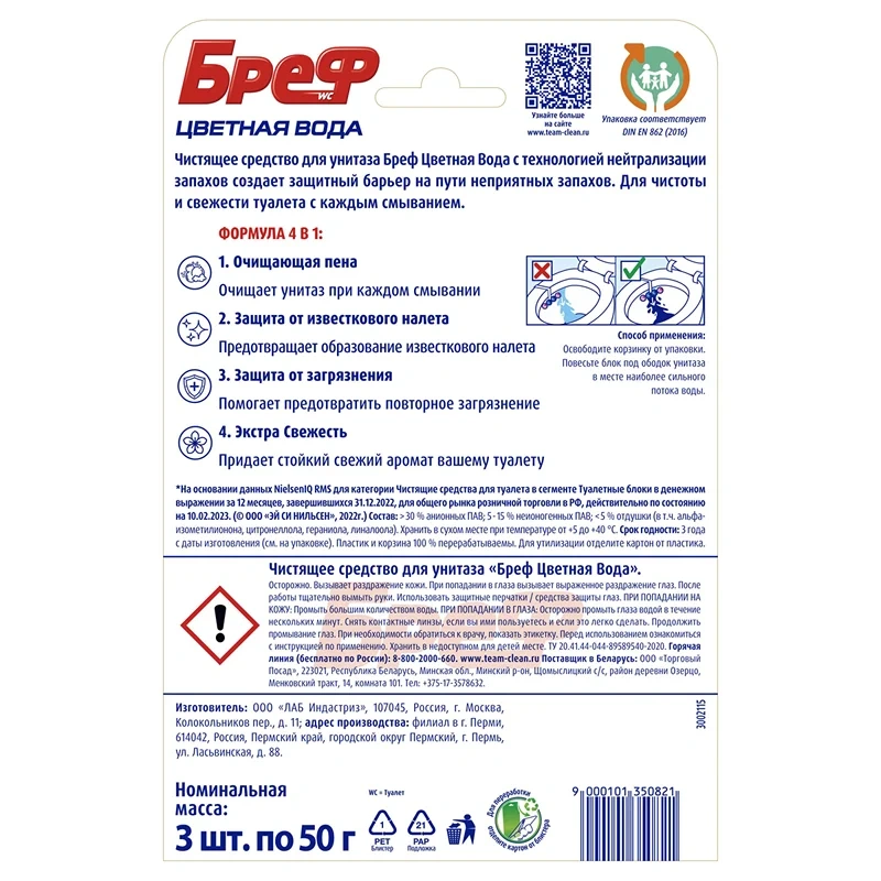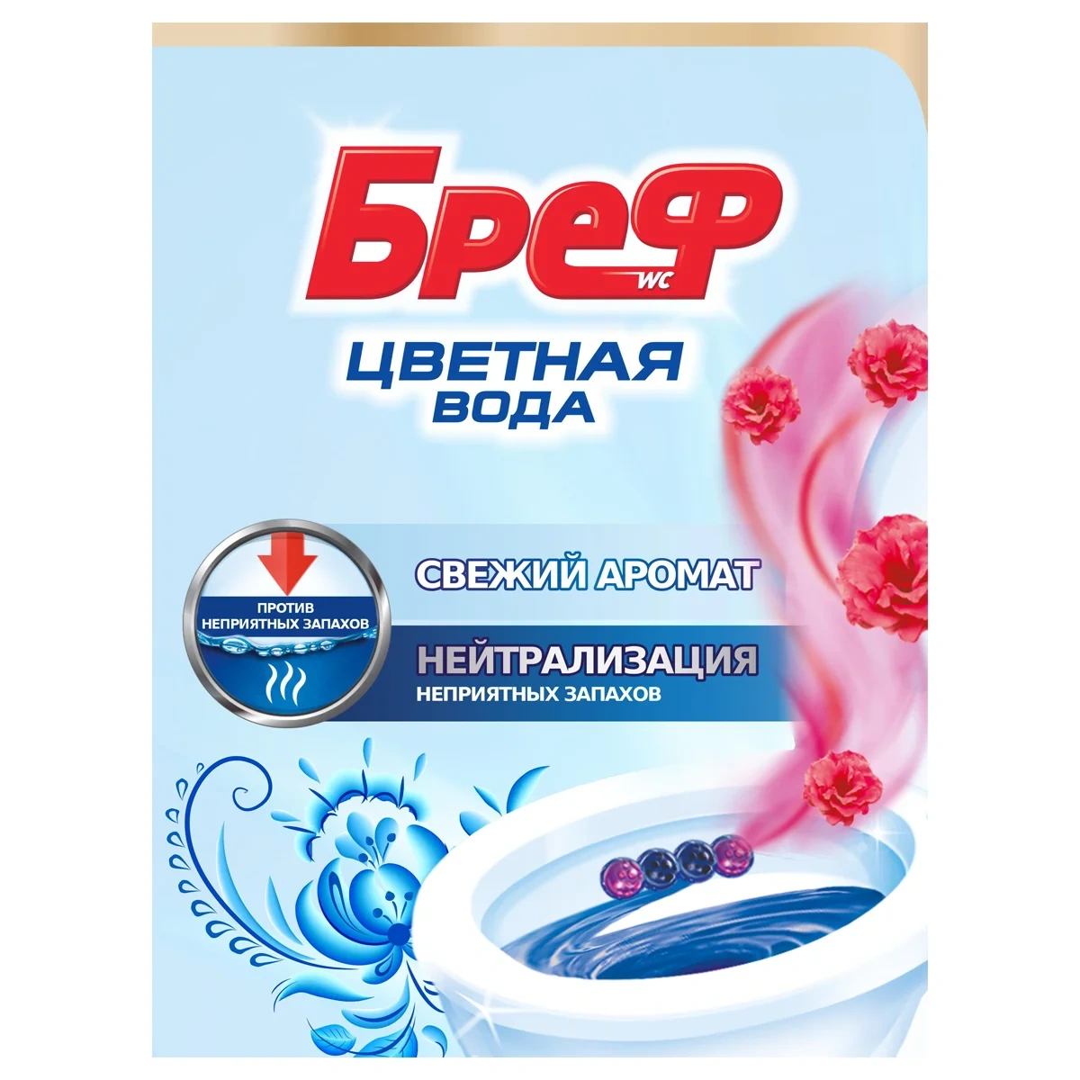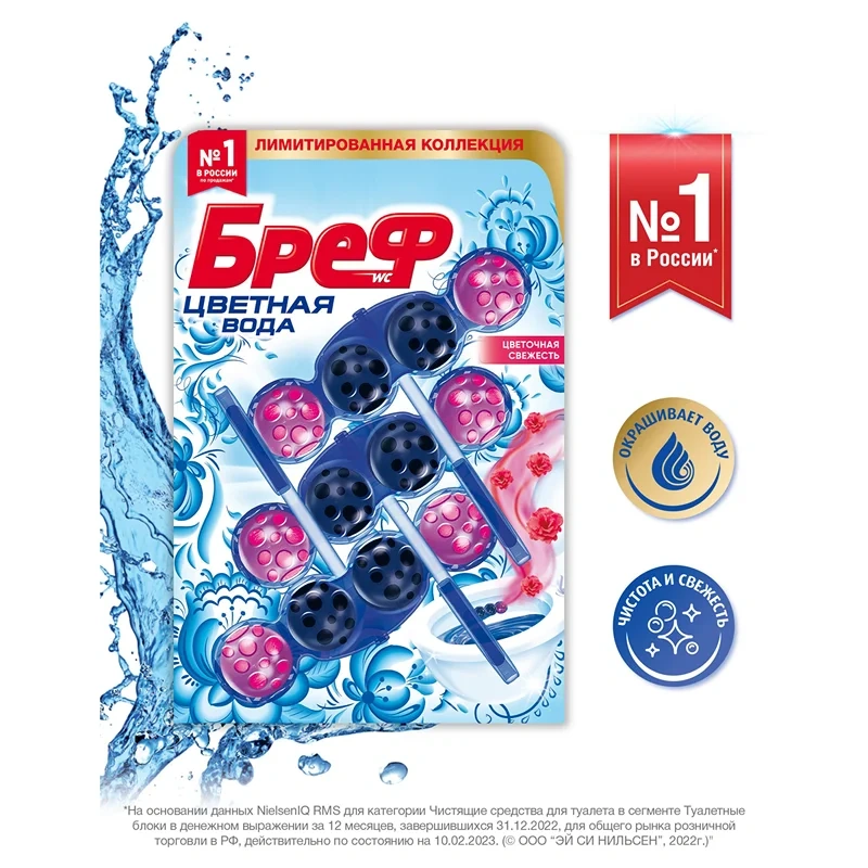 Блок для унитаза Bref Color Aktiv Цветочная свежесть, окрашивающий воду в синий цвет при каждом смывании, обеспечивает очевидную чистоту, защиту от известкового налета, свежесть и гигиену.