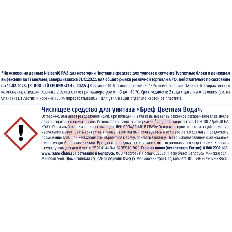 Блок для унитаза Бреф колор актив хлор-компонент (4 штуки в упаковке) Образует очищающую пену, которая обеспечивает гигиеническую чистоту; предотвращает образование известкового налета; помогает предотвратить повторное загрязнение; придает туалетной комнате свежий аромат. Способ применения. 1. Повесьте Bref Color Aktiv под ободок Вашего унитаза; 2. Выберите положение блока как можно ближе к струе воды; 3. Замените блок, когда он закончится; Меры предосторожности. Вызывает раздражение кожи. Вызывает выраженное раздражение глаз. После работы тщательно вымыть руки. Использовать защитные перчатки / средства защиты глаз. При попадании на кожу: промыть большим количеством воды. При попадании в глаза: осторожно промыть глаза водой в течение нескольких минут. Снять контактные линзы, если вы ими пользуетесь или если это легко сделать. Продолжить промывание глаз. Хранить в недоступном для детей месте. Состав. > 30 % солей неорганических, анионных ПАВ; 5-15 % неионогенных ПАВ; <5 % красителя, комплексообразователя, хлорактивного компонента растворителя, отдушки (в т.ч. лимонена, бутилфенил метилпропионаля. Условия хранения. Хранить при температуре от +5°С до +40°С. Срок годности: 24 месяца с даты изготовления.