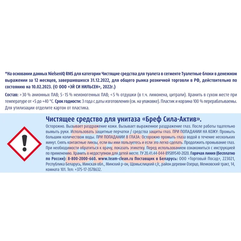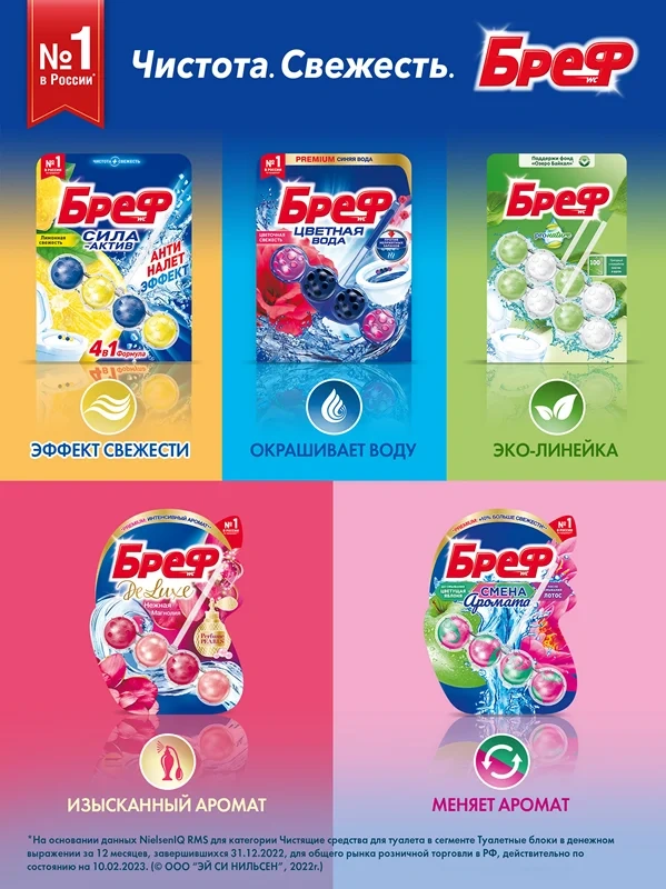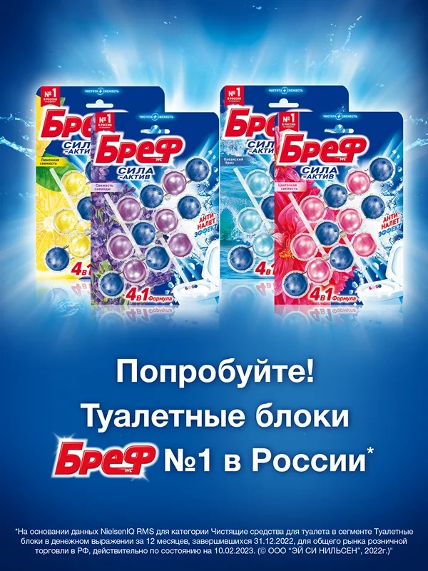 Уникальная формула 4в1 туалетного блока для унитаза Bref Сила-Актив обеспечивает гигиеническую чистоту, защиту от известкового налета, обильную пену и свежий аромат. Просто закрепите туалетный блок для унитаза под ободком унитаза рядом со струей воды и наслаждайтесь насыщенной свежестью и чистотой Вашего туалета с каждым смыванием! Продукция Bref отвечает за гигиеническую чистоту и свежесть Вашего туалета и ванной комнаты. Чистящим средствам для туалета и ванной комнаты Bref по силам справиться с самыми серьезными проблемами и устранить ржавчину, известковый налет и различные загрязнения. Средства для унитаза Bref помогут Вам поддерживать чистоту и свежесть туалета между генеральными уборками до 4 недель.