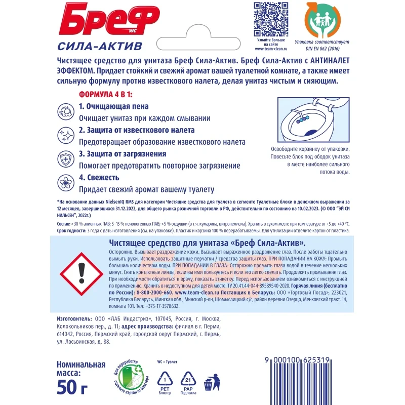 Назначение: Чистящее средство для унитаза Bref Сила-Актив Океанский Бриз — это подвесной туалетный блок с формулой 4 в 1, который обеспечивает: