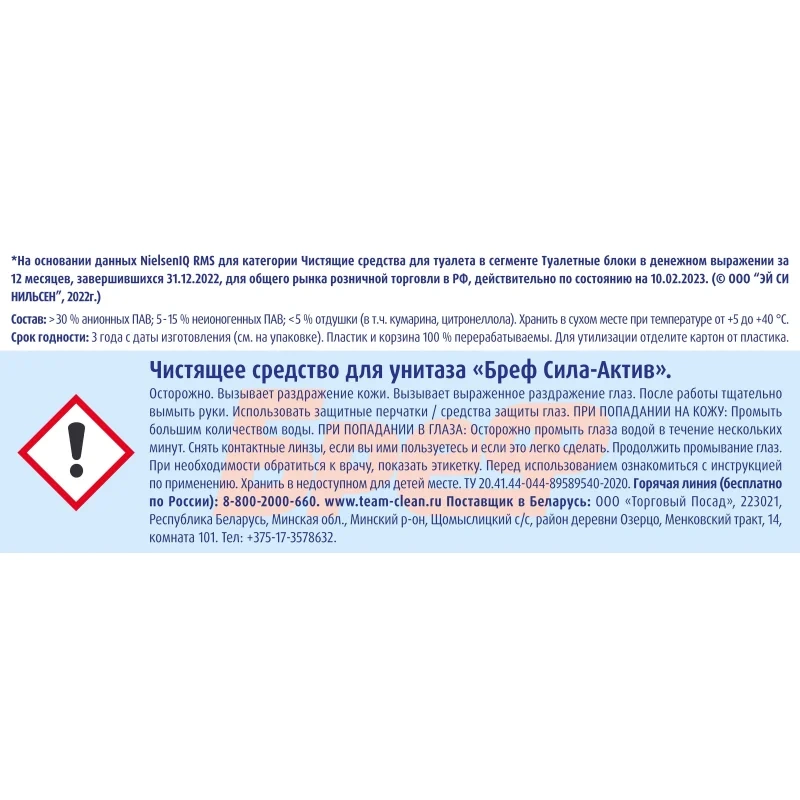 Состав: >30% анионные ПАВ; 5–15% неионогенные ПАВ; <5% краситель, комплексообразователь, растворитель, отдушка (в т. ч. кумарин, лимонен, линалоол); соли неорганические, вода.