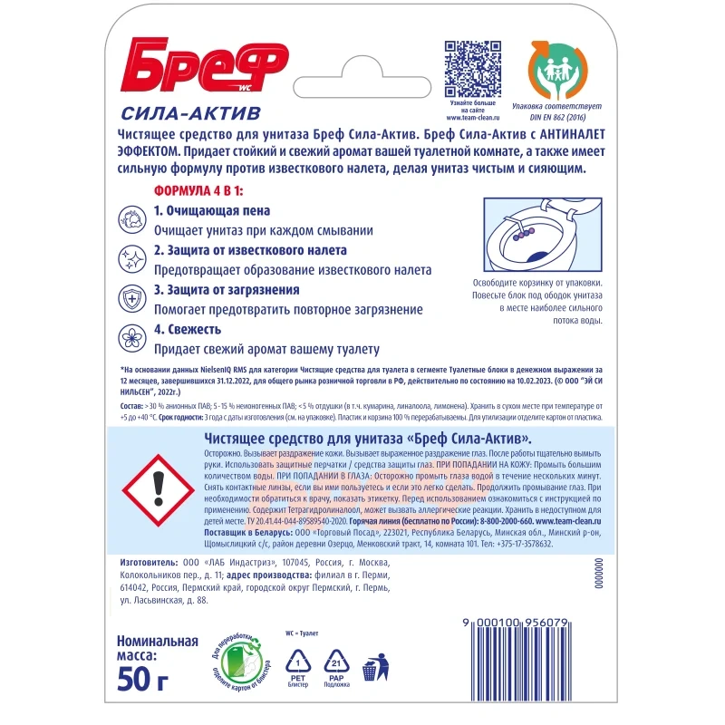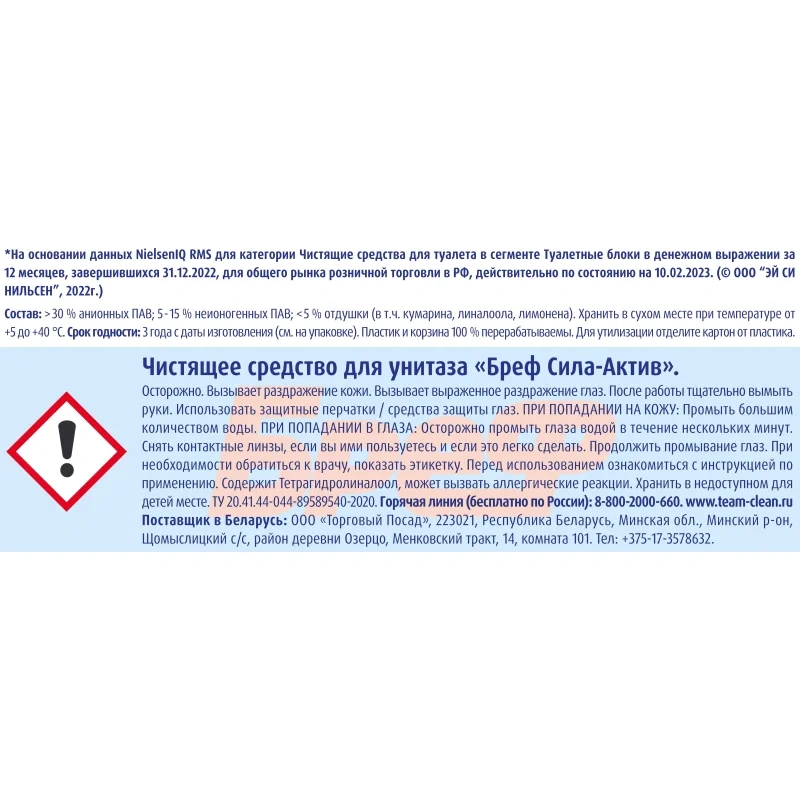 Блок для унитаза Бреф сила-актив Свежесть лаванды Образует очищающую пену, которая обеспечивает гигиеническую чистоту; предотвращает образование известкового налета; помогает предотвратить повторное загрязнение; придает туалетной комнате свежий аромат лаванды после каждого смывания. Способ применения. 1. Повесьте Bref Сила-Актив под ободок Вашего унитаза. 2. Выберите положение блока как можно ближе к струе воды. 3. Замените блок, когда он закончится. Меры предосторожности. Вызывает раздражение кожи. Вызывает выраженное раздражение глаз. После работы тщательно вымыть руки. Использовать защитные перчатки / средства защиты глаз. При попадании на кожу: промыть большим количеством воды. При попадании в глаза: осторожно промыть глаза водой в течение нескольких минут. Снять контактные линзы, если вы ими пользуетесь или если это легко сделать. Продолжить промывание глаз. Хранить в недоступном для детей месте. Состав. > 30 % анионных ПАВ, солей неорганических; 5-15% неионогенных ПАВ; <5% красителя, комплексообразователя, растворителя, отдушки (в т.ч. кумарина, линалоола, лимонена). Условия хранения. Хранить при температуре от +5°С до +40°С. Срок годности: 36 месяцев с даты изготовления.
