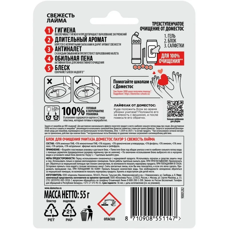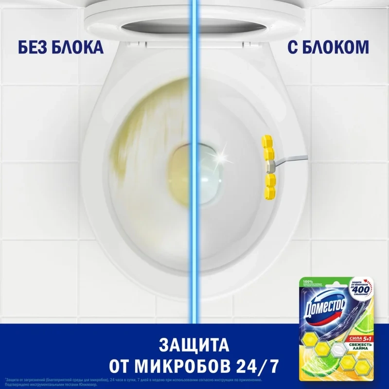 Domestos Сила 5 — пять действий, которые объединились в одном эффективном средстве для интенсивного поддержания чистоты, блеска и приятного аромата в вашем туалете. Domestos Power 5 — это эффективное средство, которое содержит в себе не один, а целых пять преимуществ, обеспечивающих защиту от загрязнений, а значит и микробов. При использовании блоков Domestos Power 5 каждое смывание — заряд свежего аромата лайма, который остается в течение длительного времени — до 4х часов.