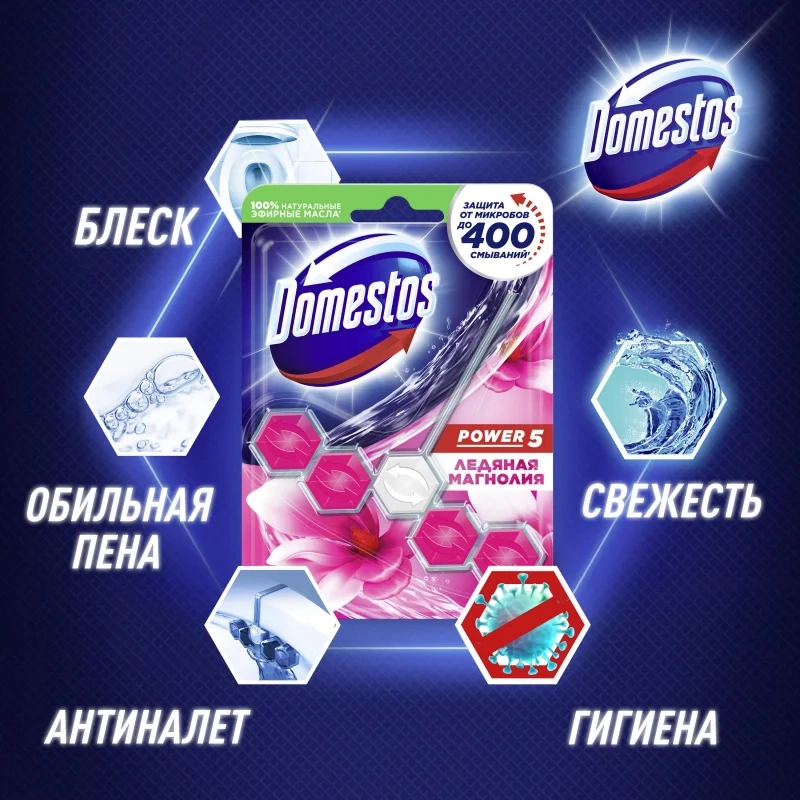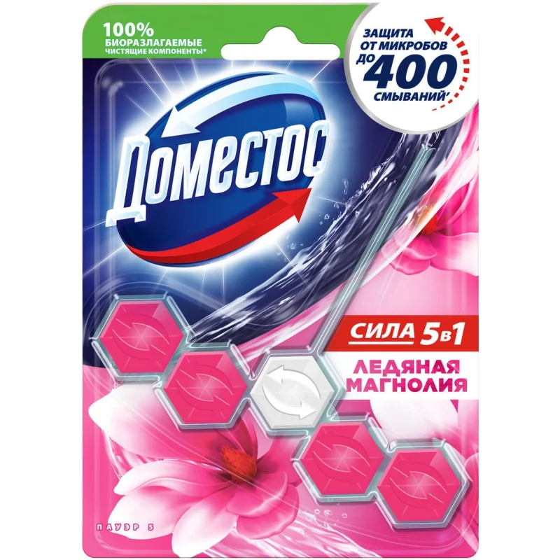 Domestos Power 5 — это эффективное средство, которое содержит в себе не один, а целых пять преимуществ, обеспечивающих защиту от загрязнений, а значит и микробов. При использовании блоков Domestos Power 5 каждое смывание — заряд свежего аромата магнолии, который остается в течение длительного времени — до 4х часов. Больше никакого налета на внутренней поверхности унитаза — блок Domestos Power 5 успешно справляется с данной задачей. Смывание за смыванием блок оставляет обильную пену и аромат, борется с налетом, поддерживает чистоту, оставляя поверхность унитаза блестящей.