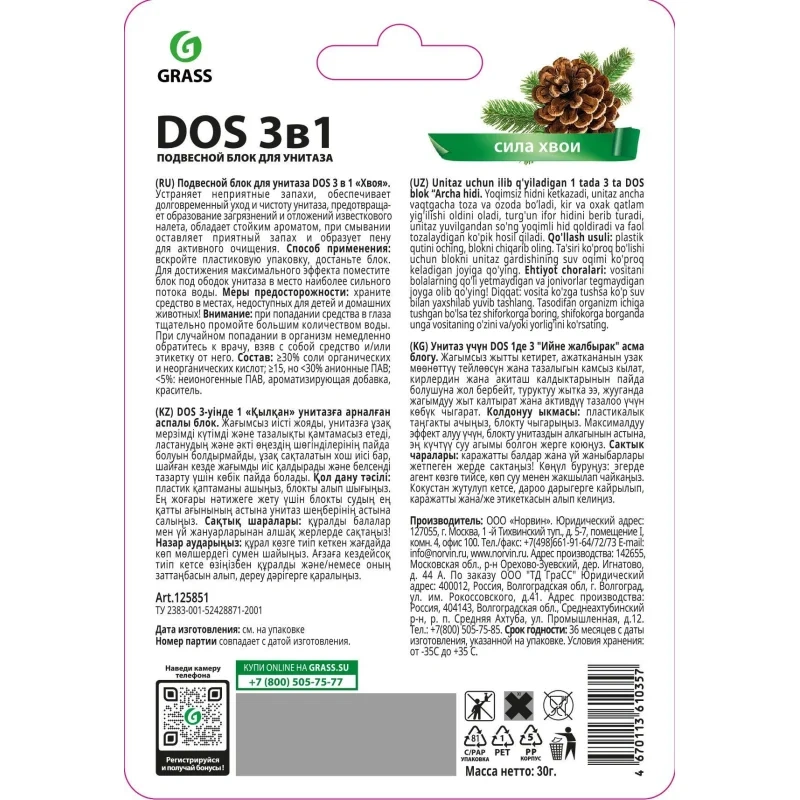 Блок для унитаза гигиенический Grass Dos Хвоя. Назначение: Устраняет неприятные запахи, обеспечивает долговременный уход и чистоту унитаза, предотвращает образование загрязнений и отложений известкового налета, обладает стойким ароматом, при смывании оставляет приятный запах и образует пену для активного очищения. Способ применения: Вскройте пластиковую упаковку, достаньте блок. Для достижения максимального эффекта поместите блок под ободок унитаза в место наиболее сильного потока воды. Меры предосторожности: Избегать попадания прямого солнечного света. Состав: 30% соли органических и неорганических кислот; 15, но <30% анионные ПАВ; <5%: неионогенные ПАВ, ароматизирующая добавка, краситель. Условия хранения: Хранить в сухом прохладном месте, плотно закрытым. Срок годности: 36 месяцев..