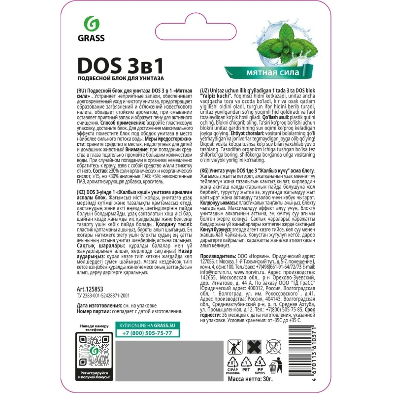 Блок для унитаза гигиенический Grass Dos Мятная сила. Назначение: Устраняет неприятные запахи, обеспечивает долговременный уход и чистоту унитаза, предотвращает образование загрязнений и отложений известкового налета, обладает стойким ароматом, при смывании оставляет приятный запах и образует пену для активного очищения. Способ применения: Вскройте пластиковую упаковку, достаньте блок. Для достижения максимального эффекта поместите блок под ободок унитаза в место наиболее сильного потока воды. Меры предосторожности: Избегать попадания прямого солнечного света. Состав: 30% соли органических и неорганических кислот; 15, но <30% анионные ПАВ; <5%: неионогенные ПАВ, ароматизирующая добавка, краситель. Условия хранения: Хранить в сухом прохладном месте, плотно закрытым. Срок годности: 36 месяцев..