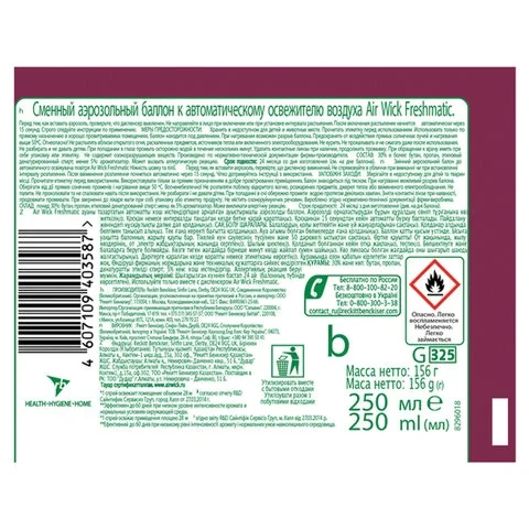 Меры предосторожности: хранить в недоступном для детей и животных месте. Беречь от солнечных лучей, избегать нагревания выше 50°С. Беречь от источников воспламенения/нагревания/искр/открытого огня. Не курить. Не распылять вблизи открытого огня или других источников воспламенения. Не нарушать целостности упаковки и не сжигать, даже после использования. Не разбирать и не давать детям. При попадании в глаза: осторожно промыть глаза водой в течение нескольких минут. Снять контактные линзы, если Вы ими пользуетесь и, если это легко сделать. Продолжить промывание глаз. При необходимости обратиться за медицинской помощью, по возможности показать упаковку/маркировку продукта. Использовать только по прямому назначению. Не вдыхать аэрозоль. Использовать с осторожностью при повышенной чувствительности к парфюмерным отдушкам. Освежители воздуха не являются заменой надлежащих мер гигиены. Использовать только в хорошо проветриваемых помещениях. Более полная информация по безопасному обращению химической продукции находится в паспорте безопасности.