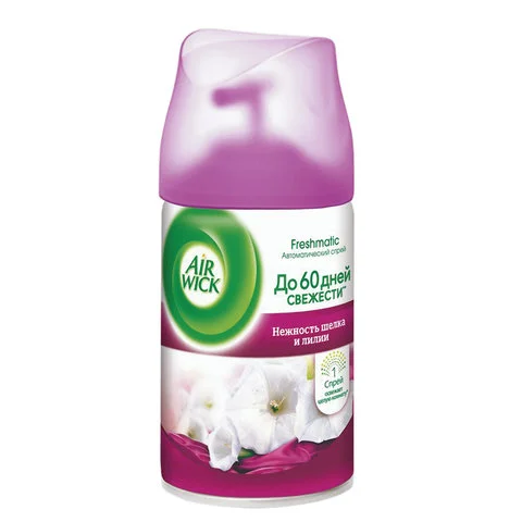 Назначение/особенности: наслаждайтесь изысканным ароматом шелка и лилии в течение 70 дней вместе с аэрозольным освежителем Air Wick Freshmatic Нежный шёлк и лилия. Баллон сменный освежителя воздуха поможет поддерживать в доме приятный и свежий аромат. Средство прекрасно борется с любыми нежелательными запахами. Его можно устанавливать на кухне, в ванной комнате или туалете. Аэрозоль не оставляет разводов и других следов на занавесках, мебели и других предметах.