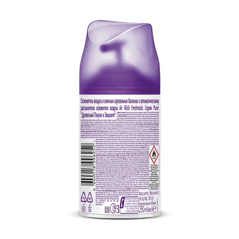 Наполните дом чарующим сочетанием ароматов пачули и эвкалипта с Air Wick Pure Древесный Пачули и Эвкалипт. Содержит эфирные масла****. Вставьте сменный баллон в элегантное устройство, выберите интенсивность распыления, и Air Wick Freshmatic будет бороться с неприятными запахами* автоматически день за днем. Преимущества автоматического освежителя Air Wick Freshmatic: - До 60 дней свежести**; - 1 спрей освежает целую комнату***; - Содержит эфирные масла****; - Рекомендуется использовать с автоматическим аэрозольным освежителем Air Wick Freshmatic. *На основании отчета исследовательского центра Рекитт Бенкизер (Халл, Великобритания) от 23 августа 2018 года в отношении запахов в туалете, на кухне, а также животных. **Эффективен до 60 дней при низком уровне интенсивности аромата и нормальных условиях окружающей среды. ***1 спрей освежает помещение объемом 28 м3 согласно данным исследовательского центра Рекитт Бенкизер, отчет №зк-14-04-02 от 27.03.2014 г.