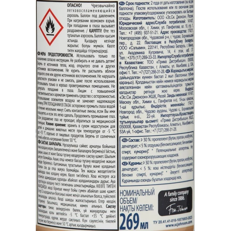 Меры предосторожности: использовать только по назначению согласно инструкции. Не разбирать и не давать детям! Беречь от источников воспламенения, нагревания, искр, открытого огня. Не курить. Не распылять вблизи открытого огня и других источников воспламенения. Не нарушать целостности упаковки и не сжигать, даже после использования. Избегать вдыхания аэрозоля. Использовать только в хорошо проветриваемых помещениях. Не допускать попадания в глаза. Лицам с повышенной чувствительностью к ароматам применять средство с осторожностью. Использование освежителя воздуха не заменяет надлежащую гигиену. При попадании в глаза: осторожно промыть глаза водой в течение нескольких минут. Снять контактные линзы, если Вы ими пользуетесь и если это легко сделать. Продолжить промывание глаз. Если раздражение глаз не проходит, обратиться за медицинской помощью.