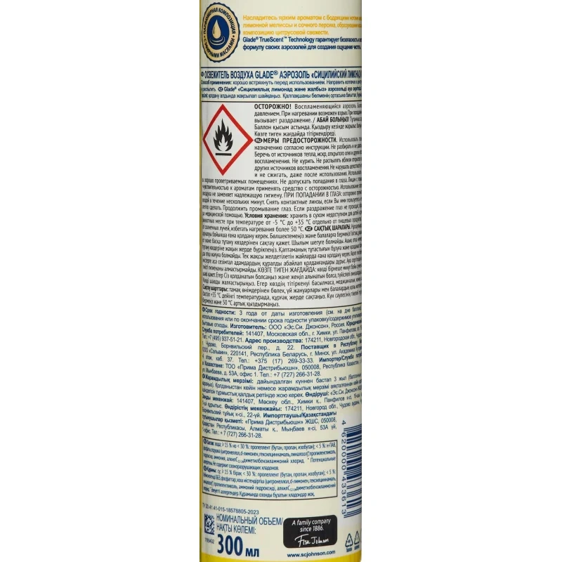 Назначение/особенности: насладитесь ярким ароматом с нотами бодрящего лимона, золотого мандарина и сочного персика, образующими насыщенную композицию фруктовой свежести. Glade TrueScent Technology гарантирует безопасность и экспертную формулу своих аэрозолей для создания ощущения чистоты. Преимущества продукта: True Scent Technology гарантирует безопасность и экспертную формулу своих аэрозолей для создания ощущения чистоты. Парфюмерные композиции с эфирными маслами. Борется с неприятными запахами. Действует мгновенно. Ароматы высокого качества, разработанные лучшими парфюмерными домами мира. Полностью перерабатываемая упаковка.