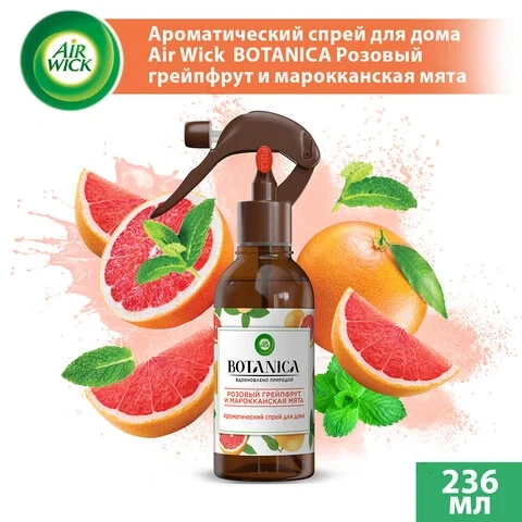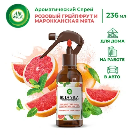 Насладитесь бодрящим ароматом розового грейпфрута в сочетании с тонкими мятными нотками. Ощутите взрыв свежести с ароматическим спреем AIRWICK BOTANICA, утонченные нотки которого мгновенно наполнят природой ваш дом.