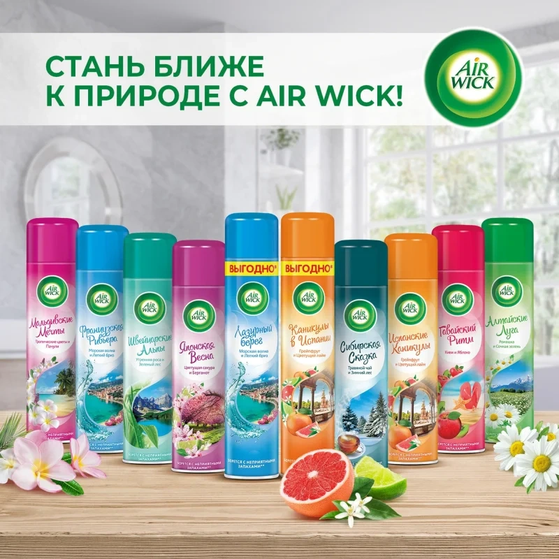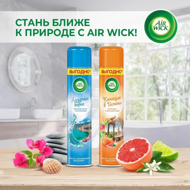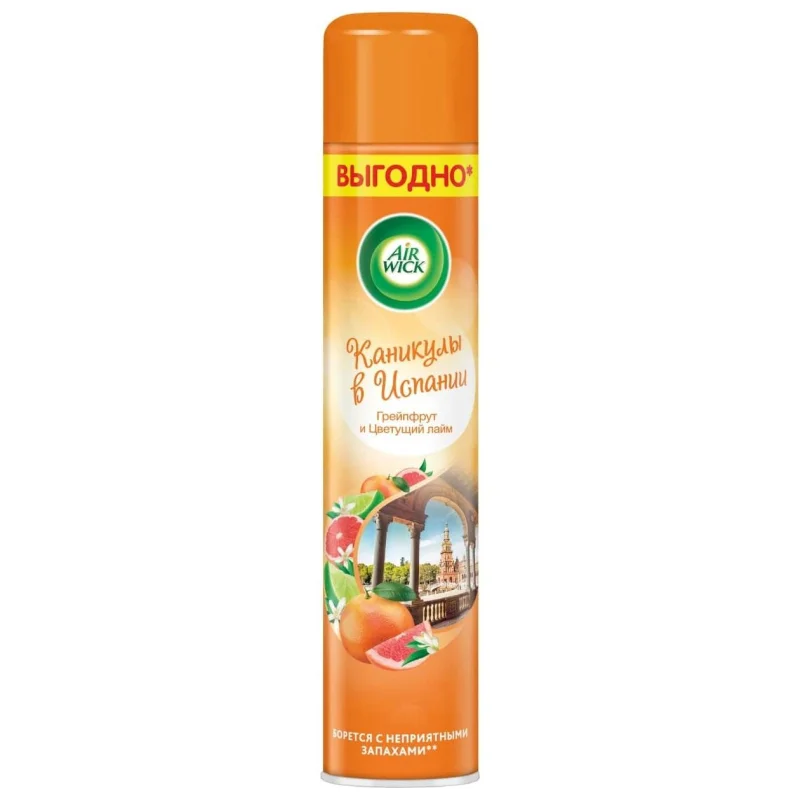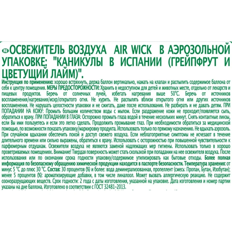 Освежитель воздуха AirWick Каникулы в Испании 400 мл. Назначение/особенности: освежитель воздуха Air Wick Каникулы в Испании из коллекции Ароматы мира в новой выгодной упаковке. Способ применения: хорошо встряхнуть, держа баллон вертикально, нажать на клапан и распылить содержимое баллона от себя к центру помещения. Меры предосторожности: хранить в недоступном для детей и животных месте, отдельно от лекарств и пищевых продуктов. Беречь от солнечных лучей, избегать нагревания выше 50С. Беречь от источников воспламенения/нагревания/искр/открытого огня. Не курить. Не распылять вблизи открытого огня или других источников воспламенения. Не нарушать целостности упаковки и не сжигать, даже после использования. Не разбирать и не давать детям. При попадании на кожу: промыть большим количеством воды с мылом. Если раздражение кожи не проходит/появляется сыпь, обратиться к врачу. При попадании в глаза: осторожно промыть глаза водой в течение нескольких минут. Снять контактные линзы, если Вы ими пользуетесь и, если это легко сделать. Продолжить промывание глаз. При необходимости обратиться за медицинской помощью, по возможности показать упаковку/маркировку продукта. Использовать только по прямому назначению. Не вдыхать аэрозоль. При случайном вдыхании обеспечить покой и доступ свежего воздуха. Если неблагоприятные симптомы не исчезают в течение длительного времени или сильно выражены, обратиться к врачу. Использовать с осторожностью при повышенной чувствительности к парфюмерным отдушкам. Освежители воздуха не являются заменой надлежащих мер гигиены. Использовать только в хорошо проветриваемых помещениях. Внимание! Твердая поверхность может стать скользкой при попадании на нее освежителя воздуха. После использования или по окончании срока годности упаковку/содержимое утилизировать как бытовые отходы. Более полная информация по безопасному обращению химической продукции находится в паспорте безопасности. Состав: 30 процентов (%) и более: вода деминерализованная, пропеллент (смесь: Пропан, Бутан, Изобутан); менее 5 процентов (%): ароматизирующие добавки, в том числе линалоол, цитронеллол, лимонен. Может вызвать аллергическую реакцию. Не содержит озоноразрущающих веществ. Условия хранения: температура хранения: от ?5C до +30C. Срок годности: 24 месяцев с даты изготовления (дату изготовления см. на упаковке).