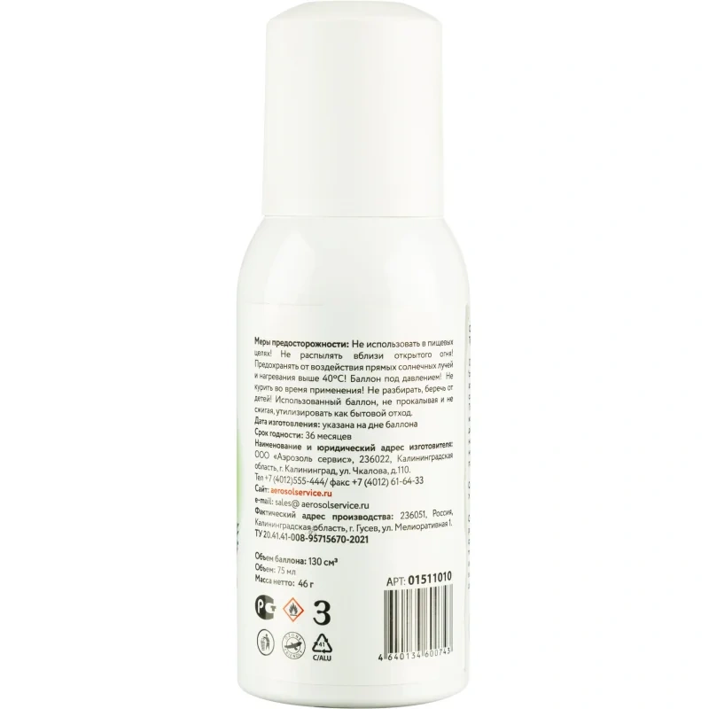 Меры предосторожности: огнеопасно! Легковоспламеняющиеся аэрозоли. Баллон находится под давлением: при нагревании может произойти взрыв. Беречь от тепла, искр, открытого огня, горячих поверхностей. Не направлять распылённую жидкость на открытое пламя или другие источники возгорания. Не протыкать и не сжигать, даже после использования. Беречь от солнечных лучей и не подвергать воздействию температур свыше 50°C. При контакте с кожей — немедленно промыть мылом и большим количеством воды. При попадании в глаза — незамедлительно промыть водой в течение длительного времени, держа веки широко разведёнными (минимум 15 минут). При проглатывании — прополоскать рот. При необходимости обратиться к врачу.