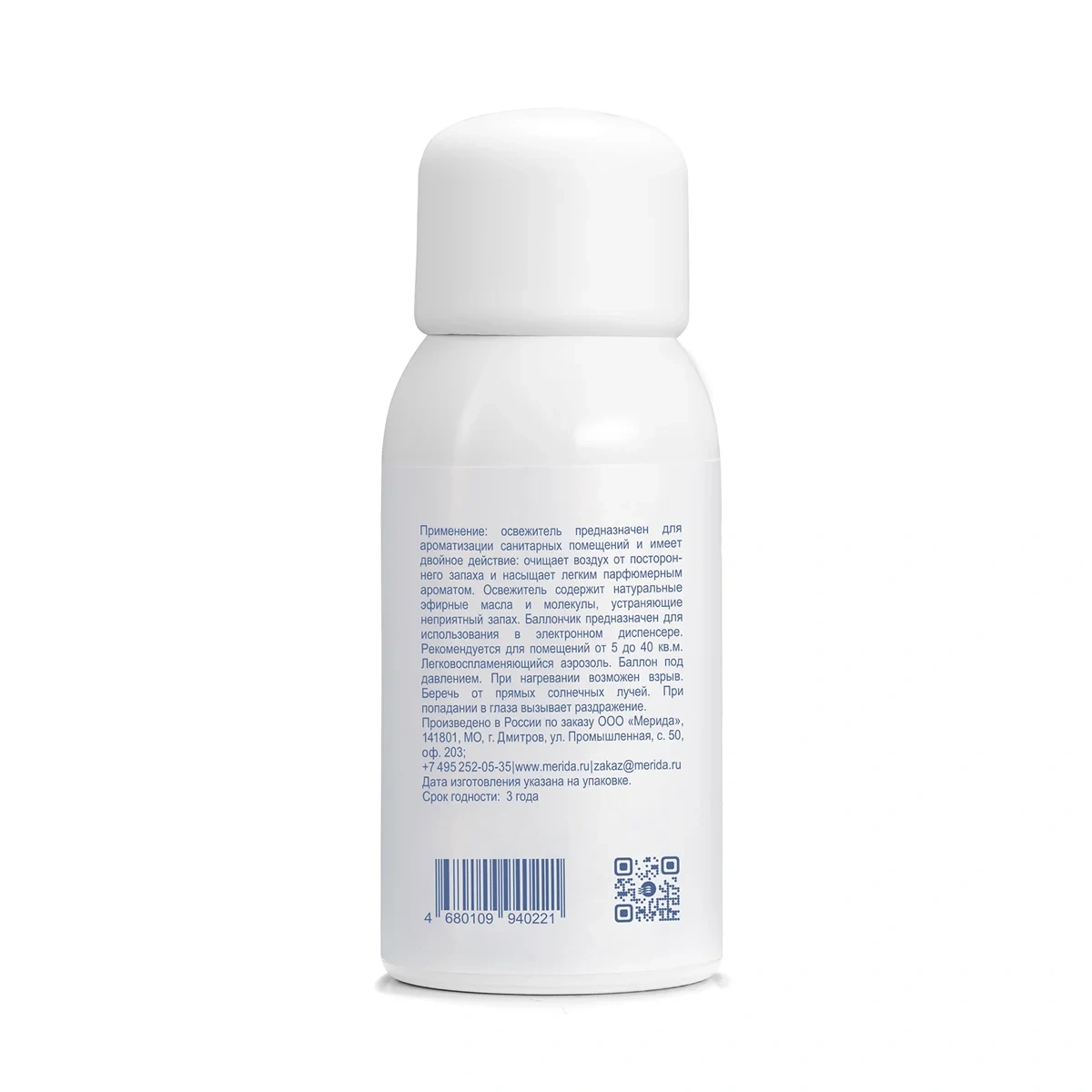 Аэрозольные освежители воздуха MERIDA включают в свой состав концентрированные ароматизаторы из натуральных эфирных масел. Рецептура не содержит в составе этилового спирта и углеводородного пропеллента (пропан/бутан/изобутан). В баллоне более 3000 порций, а концентрированный состав позволяет устанавливать интервал распыления от 30 минут. 1 баллон на 3000 порций способен поддерживать свежесть и приятный аромат в помещении более 2х месяцев.
