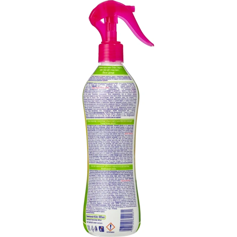 Состав: вода очищенная, парфюмерная композиция (< 0,5%), изопропиловый спирт (<0,3%), глицерин (< 0,2%), консервант (< 0,2%), неиногенноеповерхностно-активное вещество (< 0,2%).