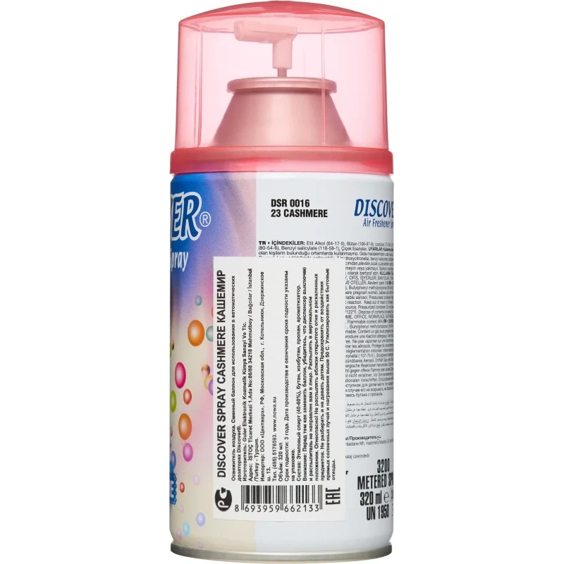 Назначение/особенности: прекрасно освежает воздух и устраняет неприятные запахи, поддерживает гигиеническую чистоту, создаёт атмосферу уюта. Верхняя нота: бергамот, мандарин, зелёный, персик, дыня. Средняя нота: морская нота, ландыш, жасмин, роза, гвоздика, иланг-иланг. Базовые ноты: кедр, мускус, гелиотроп, ваниль. Объем баллончика со спреем — 320 мл. Один баллон освежителя воздуха рассчитан на 3200 распылений, что позволяет освежать помещение до 3 месяцев (при средней интенсивности использования). Места применения: жилая комната, офис, ресторан, туалет, ванная, холл, магазин, спортивный зал и т. д. Один спрей рассчитан на освежение помещения площадью до 120 кв. м. Является расходным материалом для автоматического освежителя воздуха Discover.