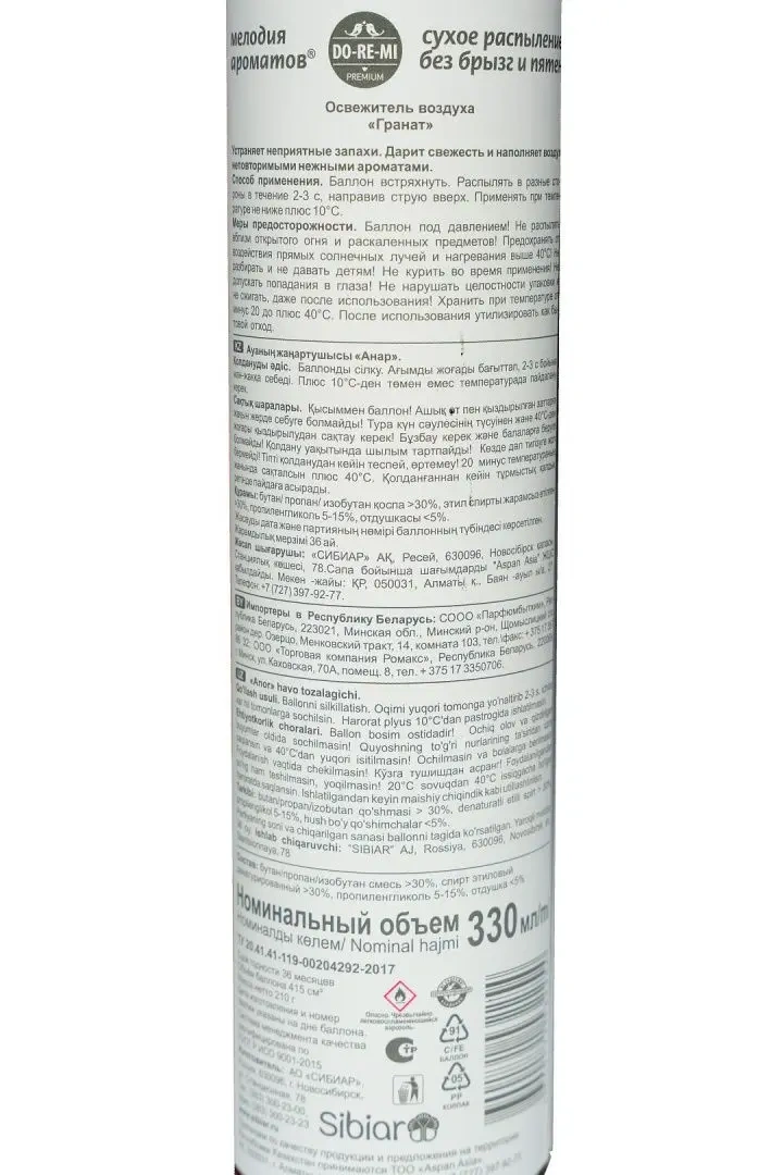 ДО-РЕ-МИ 330мл ПРЕМИУМ в ассортиментеСостав: бутан/ пропан/изобутан смесь >30%, спирт этиловый денатурированный >30%, пропиленгликоль 5-15%, отдушка 5-15 %.ТУ 20.41.41-119-00204292-2017Срок годности 36 месяцев
