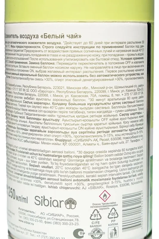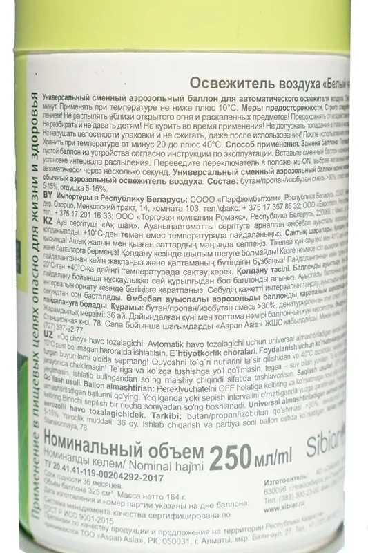 Состав: углеводородный пропеллент (бутан/ пропан/изобутан смесь) не менее 30%, спирт этиловый денатурированный не менее 30%, пропиленгликоль 5-15%, отдушка 5–15%, аллергены: лимонен, линалоол, альфа-изометилионон, бензиловый спирт, цитраль.
