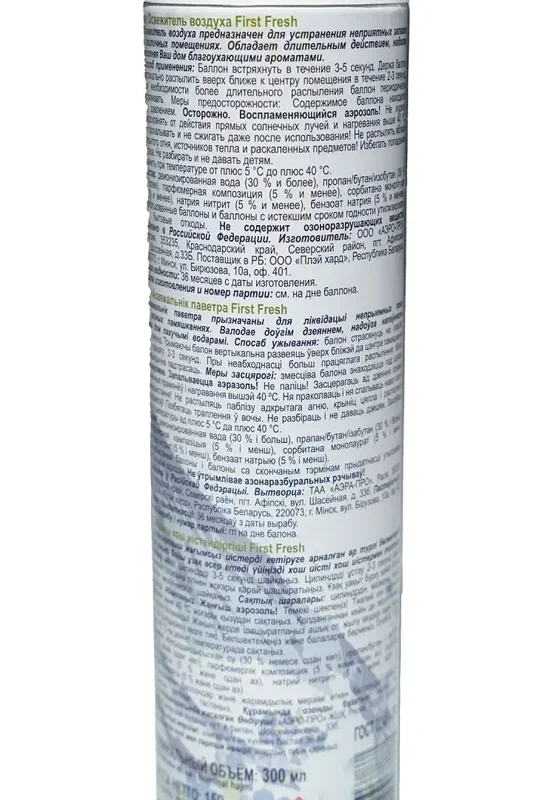 Способ применения: баллон встряхнуть в течение 3-5 секунд. Держа баллон вертикально распылить вверх ближе к центру помещения в течение 2-3 секунд. При необходимости более длительного распыления баллон периодически встряхивать.