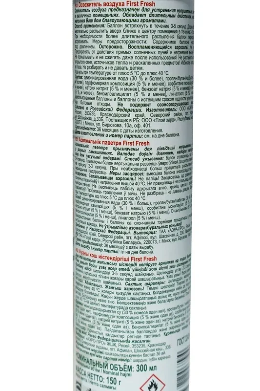 Состав: деионизированная вода (30% и более), пропан/бутан/изобутан (30% и более), парфюмерная композиция (5% и менее), сорбитана монолаурат (5% и менее), натрия нитрит (5% и менее), бензоат натрия (5% и менее).