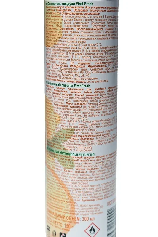 ФЕРСТ ФРЕШ 300мл ЛимонОсвежитель воздуха First Fresh «Морская свежесть» предназначен для устранения неприятных запахов в различных помещениях. Обладает длительным действием, надолго наполняя помещение неповторимым тонким ароматом. Не содержит озоноразрушающих веществ.Состав деионизованная вода (30% и более), пропан/бутан/ изобутан (30% и более), парфюмерная композиция (5% и менее), сорбитан олеат (5% и менее), натрия нитрит (5% и менее), линалоол (5% и менее)ТУ 2389-026-34995425-05СоответствуетГОСТ Р 51697-2000ГОСТ 32481-2013ГОСТ Р 51696-2000ГОСТ 32478-2013