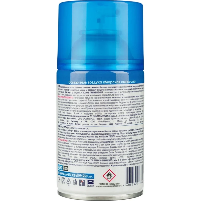 Освежитель воздуха First Fresh Морская свежесть 300 мл Назначение/особенности: предназначен для устранения неприятных запахов вразличных помещениях. ТУ2389-001-87957643-2009 или ГОСТ 32481-2013. Способ применения: баллон встряхнуть втечение 3-5секунд. Держа баллон вертикально распылить вверх ближе кцентру помещения втечение 2-3секунд. При необходимости более длительного распыления баллон периодически встряхивать. Меры предосторожности: осторожно! Воспламеняющийся аэрозоль! Содержимое баллона находится под давлением. При нагревании возможен взрыв. Предохранять отдействия прямых солнечных лучей инагревания выше 40С.Невскрывать инесжигать даже после использования! Нераспылять вблизи открытого огня, источников тепла ираскалённых предметов! Некурить! Избегать попадания вглаза. Неразбирать инедавать детям. Состав: деионизированная вода (30% иболее), пропан/бутан/изобутан (30% иболее), парфюмерная композиция (5%именее), сорбитана монолаурат (5%именее), натрия нитрит (5%именее), бензоат натрия (5%именее). Условия хранения: хранить при температуре от5С до40С.Использованные баллоны ибаллоны систёкшим сроком годности утилизировать как бытовые отходы. Несодержит озоноразрушающих веществ. Срок годности: 24месяца сдаты изготовления (дату изготовлениясм.наупаковке).