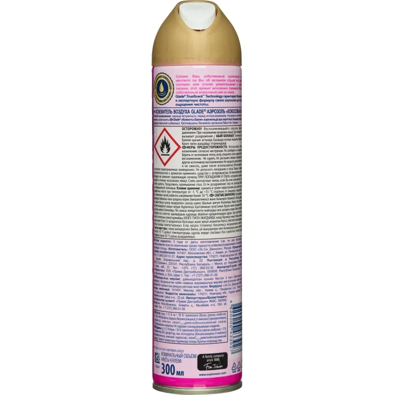 Освежитель воздуха Glade Кокосовый Бали 300 мл Назначение/особенности: словно Ваш собственный тропический оазис. Мечтаетели Выобактивном отдыхе под ласковым солнцем или уголке умиротворения вроскошной тишине, этот аромат мгновенно перенесёт Вас сВаш собственный кокосовый рай наЗемле. Преимущества продукта: True Scent Technology гарантирует безопасность иэкспертную формулу своих аэрозолей для создания ощущения чистоты. Парфюмерные композиции сэфирными маслами. Борется снеприятными запахами. Действует мгновенно. Ароматы высокого качества, разработанные лучшими парфюмерными домами мира. Полностью перерабатываемая упаковка. Способ применения: хорошо встряхнуть перед использованием. Направить колпачок кцентру комнаты ираспылить. Осторожно! Воспламеняющийся аэрозоль. Баллон под давлением. При нагревании возможен взрыв. При попадании вглаза вызывает раздражение. Меры предосторожности: использовать только поназначению согласно инструкции. Неразбирать инедавать детям! Беречь отисточников воспламенения, нагревания, источника искр, открытого огня. Некурить. Нераспылять вблизи открытого огня или других источников воспламенения. Ненарушать целостности упаковки инесжигать, даже после использования. Использовать только вхорошо проветриваемых помещениях. Недопускать попадания вглаза. Лицам сповышенной чувствительностью кароматам применять средство состорожностью. Использование освежителя воздуха незаменяет надлежащую гигиену. При попадании вглаза: осторожно промыть под водой втечение нескольких минут. Снять контактные линзы, еслиВы ими пользуетесь иесли это легко сделать. Продолжить промывание глаз. Если раздражение глаз непроходит, обратиться замедицинской помощью. Состав: вода; < 15%, но < 30%: пропеллент (бутан, пропан, изобутан); < 5%: н-ПАВ, фосфаты, отдушка (бензилсалицилат), пропиленгликоль, гидроксид аммония, алкил С12-16 диметилбензиламмоний хлорид. Условия хранения: хранить всухом недоступном для детей идомашних животных месте при температуре от 5С до35С градусов отдельно отпищевых продуктов. Беречь отпрямых солнечных лучей, избегать нагревания выше 50С. Срок годности: 3года сдаты изготовления (дату изготовлениясм.наупаковке). После использования или поокончании срока годности упаковку/содержимое утилизировать как бытовые отходы.
