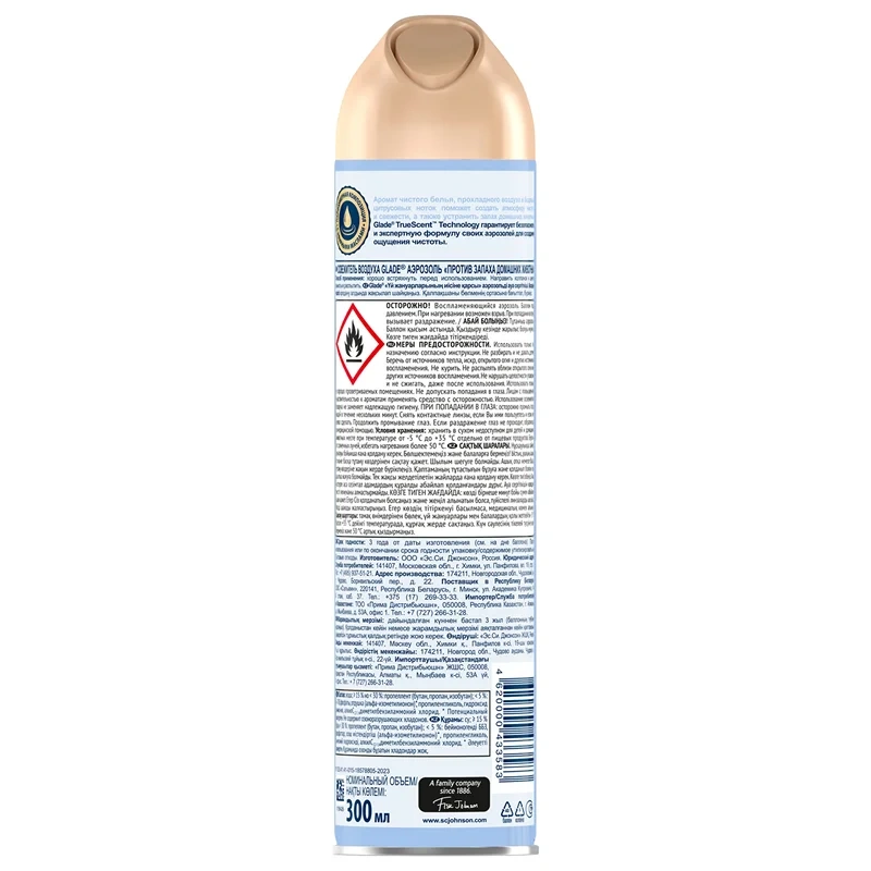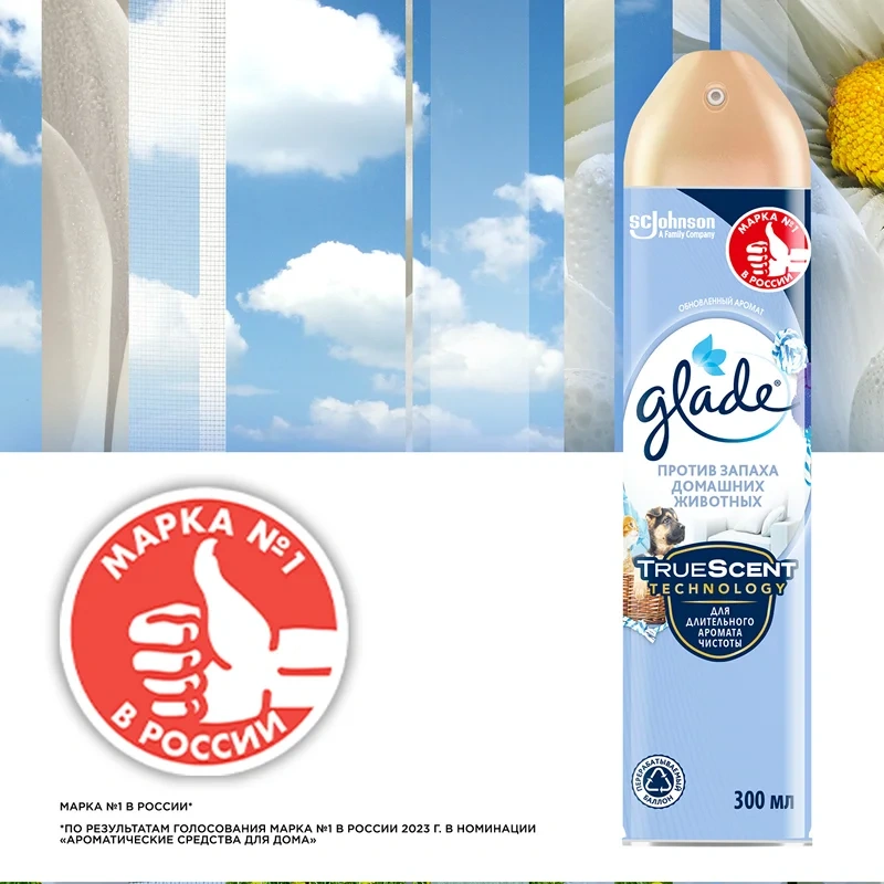 Аромат чистого белья, прохладного воздуха и бодрящих цитрусовых ноток поможет создать атмосферу чистоты и свежести, а также устранить запах домашних животных. Glade TrueScent Technology гарантирует безопасность и экспертную формулу своих аэрозолей для создания ощущения чистоты.