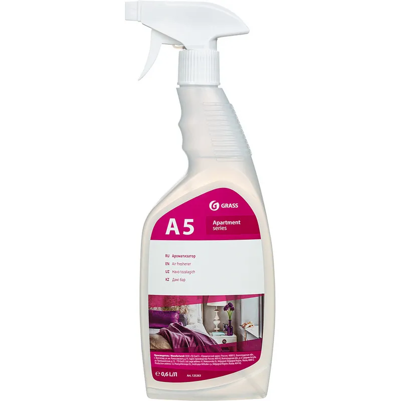 Освежитель воздуха Grass Apartment series A5600 мл Назначение. Готовое кприменению средство предназначено для дезодорации воздуха. Надолго оставляет свежий аромат. Рекомендовано для использования вгостиничном хозяйстве, вофисах ивбыту. Способ применения. Средство распылить спомощью триггера понаправлению вверх ицентр комнаты. Состав: очищенная вода, неионогенные ПАВ, ароматизирующая добавка, метилхлороизоциазолинон иметилизоциазолинон Меры предосторожности: хранить вместах недоступных для детей, вдали отпищевых продуктов. Несмешивать сдругими средствами. Перед применением прочесть инструкцию. При работе пользоваться резиновыми перчатками, защитой глаз. При попадании вглаза или накожу промыть большим количеством воды, обратиться запомощью при необходимости. Более подробная информация содержится впаспорте безопасности. Хранение: взаводской упаковке при температуре от5до25С.Недопускать замораживания ипопадания прямых солнечных лучей. Срок годности: 1,5 года смомента производства (дату изготовлениясм.наупаковке) при соблюдении условий хранения рекомендованных производителем.
