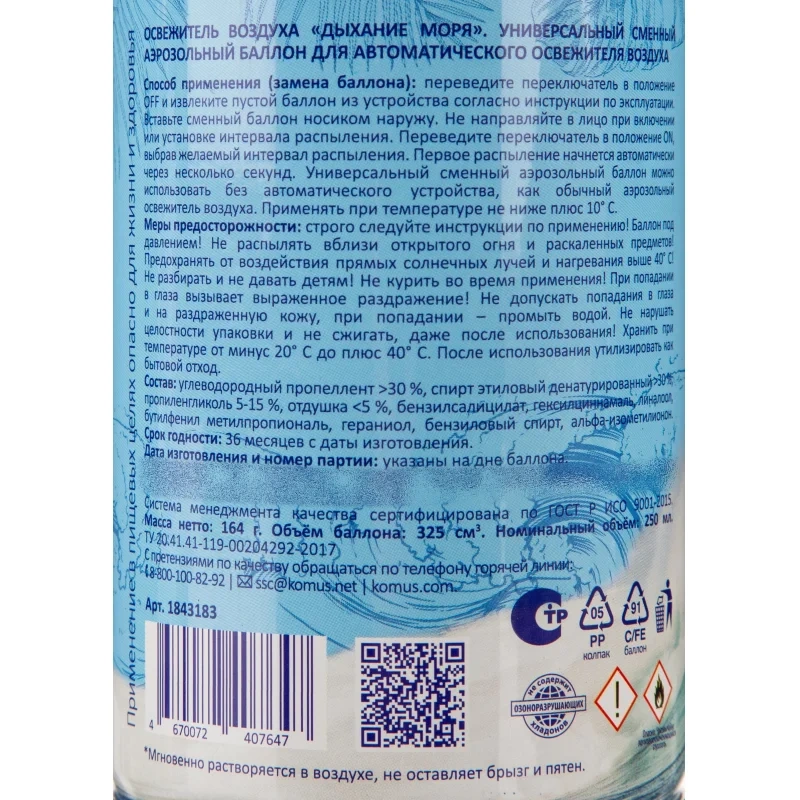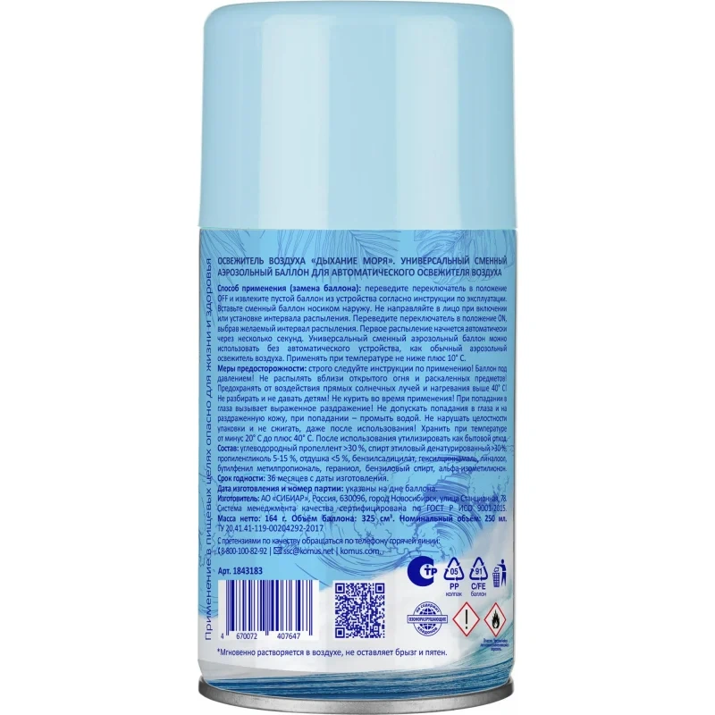 Баллон сменный для автоматического освежителя Luscan Дыхание моря 250 мл сухое распыление