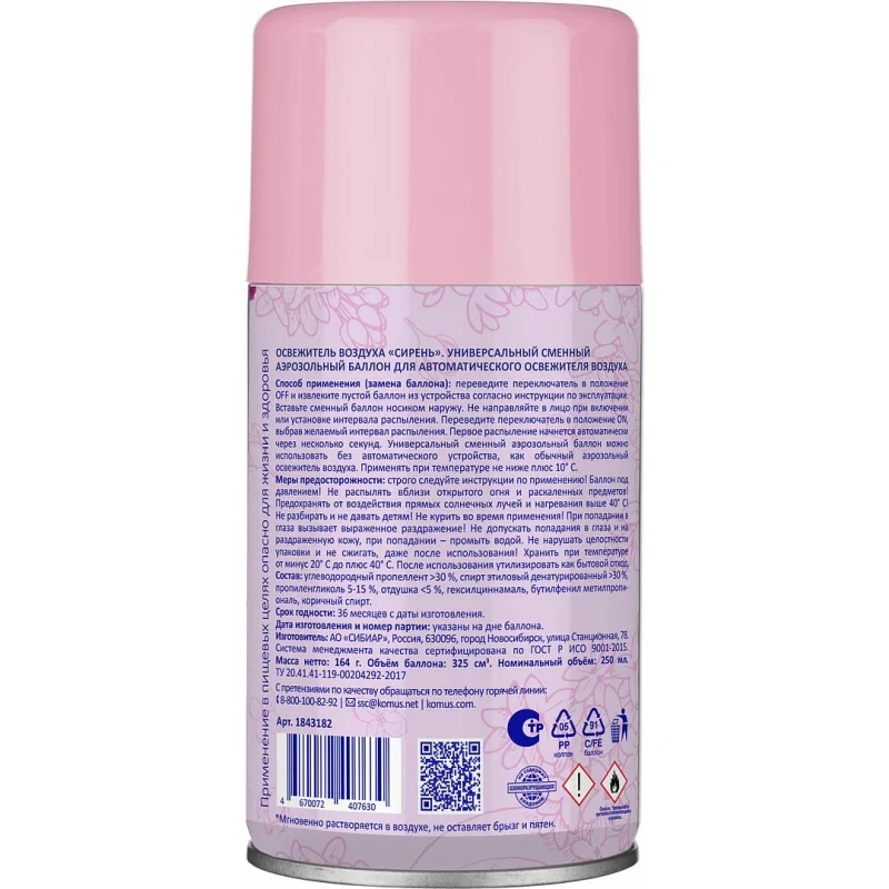 Назначение: универсальный Баллон сменный Luscan подходит для автоматических систем дезодорирования, устраняет неприятные запахи и дарит нежный аромат сирени. Подходит для дома и любых общественных мест. Формула сухого распыления экономична в использовании и не оставляет следов на поверхности.