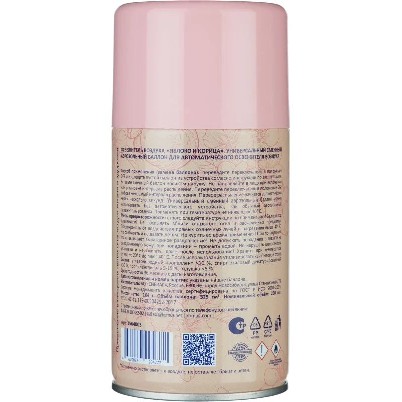 Баллон сменный для автоматического освежителя Luscan Яблоко и корица 250 мл сухое распыление