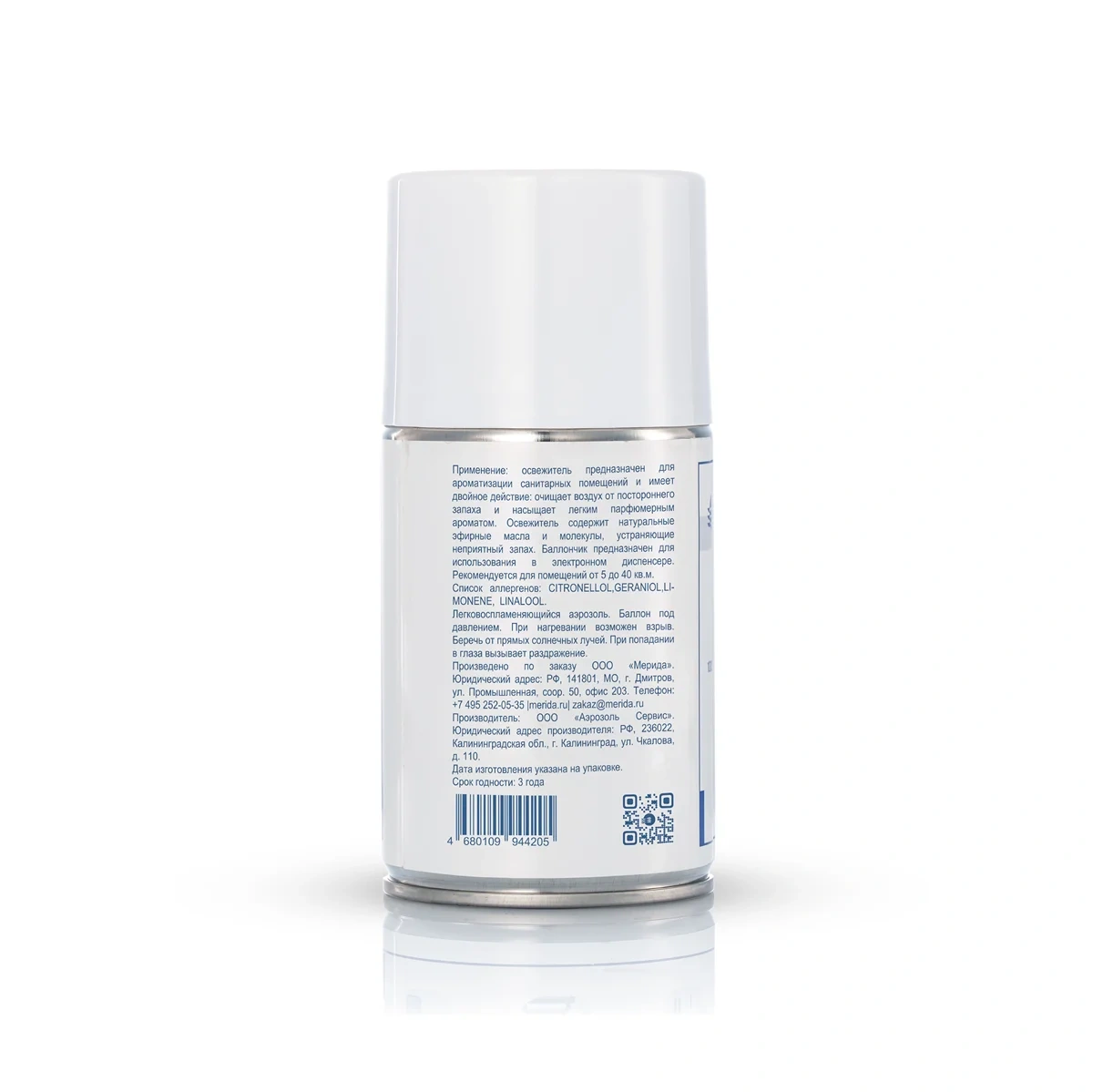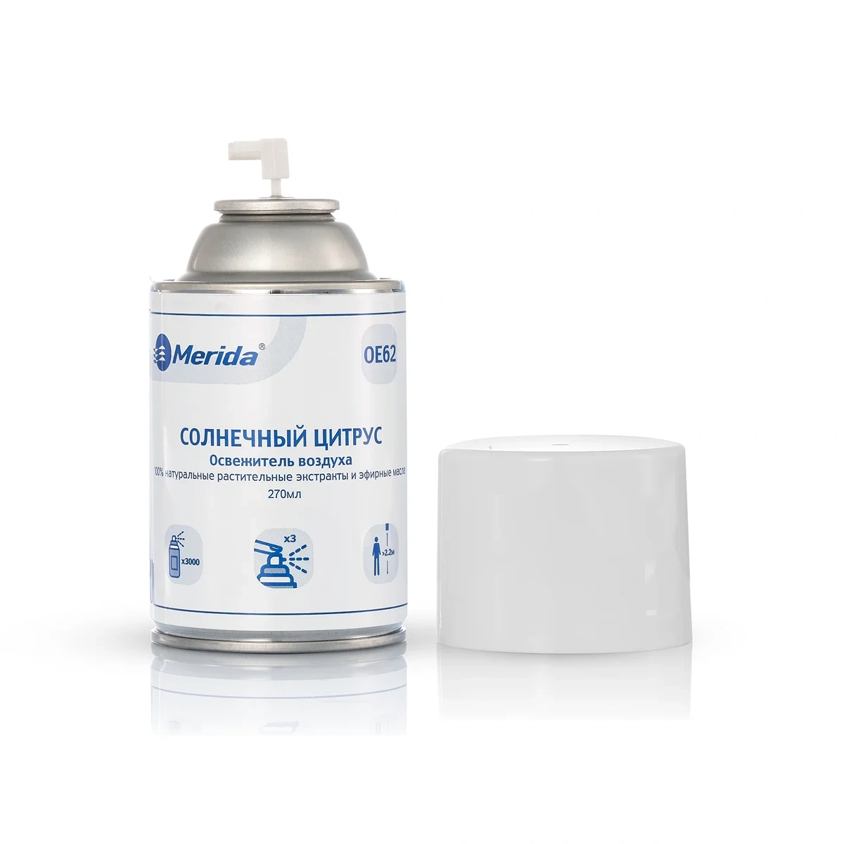 Аэрозольные освежители воздуха MERIDA включают в свой состав концентрированные ароматизаторы из натуральных эфирных масел. Рецептура не содержит в составе этилового спирта и углеводородного пропеллента (пропан/бутан/изобутан). В баллоне более 3000 порций, а концентрированный состав позволяет устанавливать интервал распыления от 30 минут. 1 баллон на 3000 порций способен поддерживать свежесть и приятный аромат в помещении более 2х месяцев.